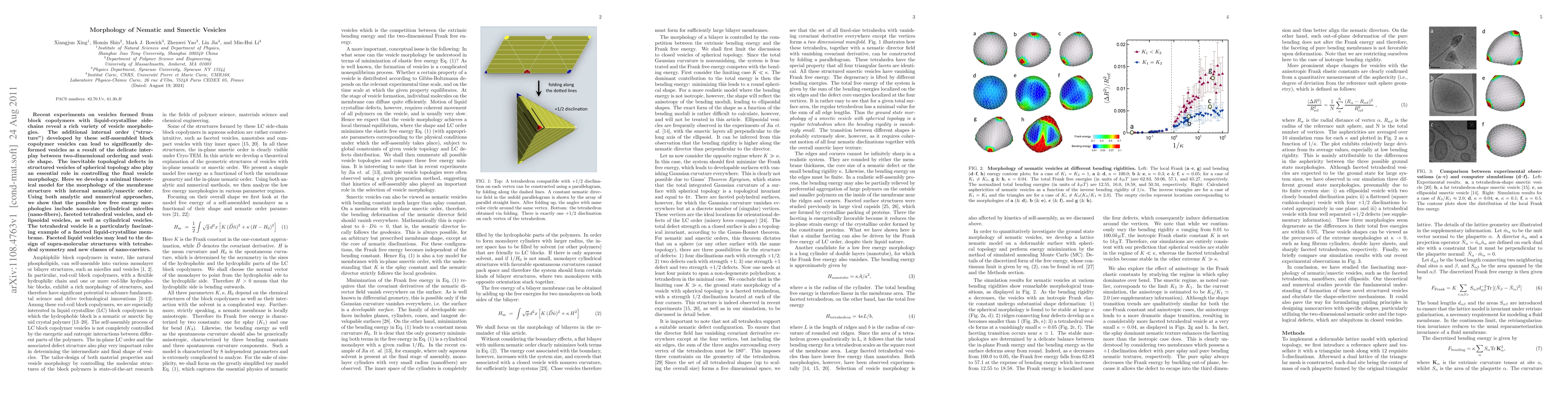 This paper explores the diverse morphologies of vesicles formed from block copolymers with liquid-crystalline side-chains, revealing nano-fibers, tetrahedral, ellipsoidal, and cylindrical vesicles due to internal nematic/smectic order and topological defects. The study proposes a theoretical model to understand these shapes, highlighting the potential for designing new nano-carriers with tetrahedral symmetry.