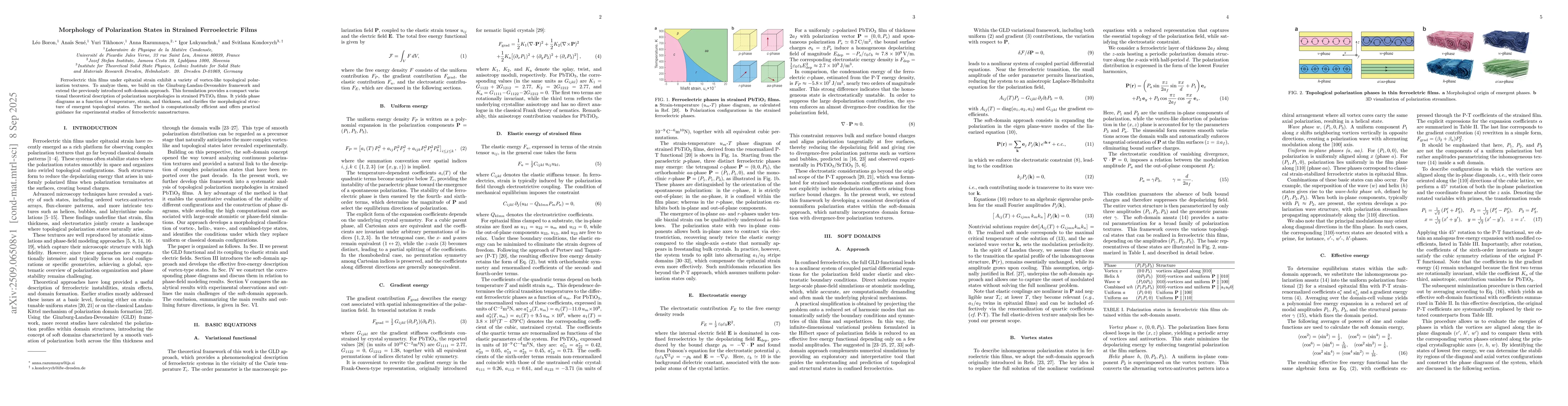 Ferroelectric thin films under epitaxial strain exhibit a variety of vortex-like topological polarization textures. To analyze them, we build on the Ginzburg-Landau-Devonshire framework and extend the previously introduced soft-domain approach. This formulation provides a compact variational theoretical description of polarization morphologies in strained PbTiO$_3$ films. It yields phase diagrams as a function of temperature, strain, and thickness, and clarifies the morphological structure of emergent topological states. The method is computationally efficient and offers practical guidance for experimental studies of ferroelectric nanostructures.