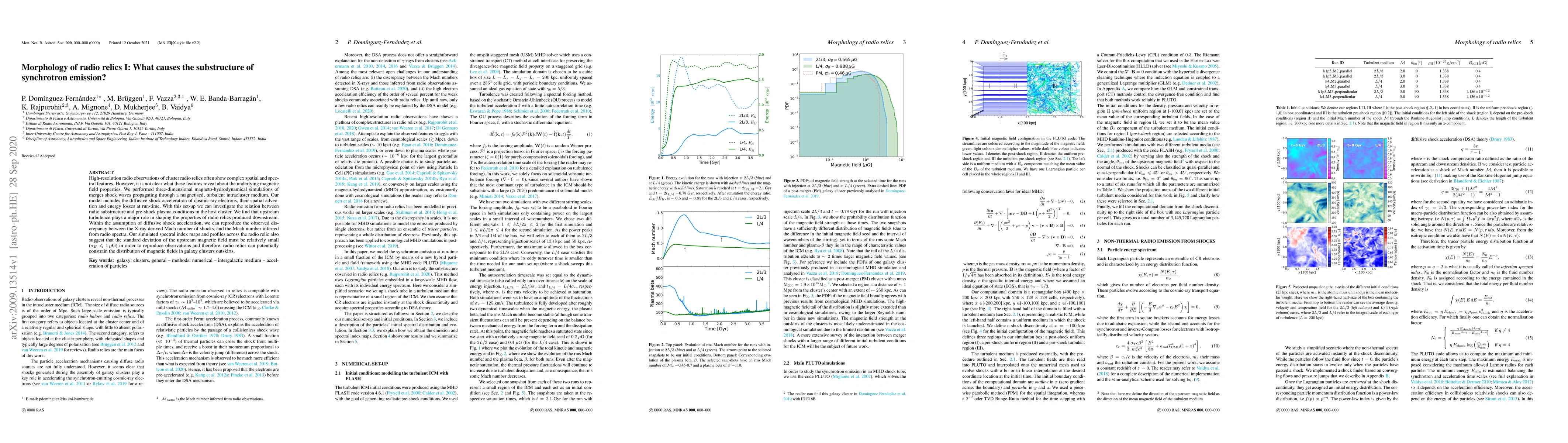 This paper investigates the morphology of radio relics in galaxy clusters using magneto-hydrodynamical simulations, finding that upstream turbulence significantly shapes the radio substructure. The study suggests that a relatively small standard deviation of the upstream magnetic field is required to match observations, indicating radio relics can constrain magnetic field distributions in cluster outskirts.