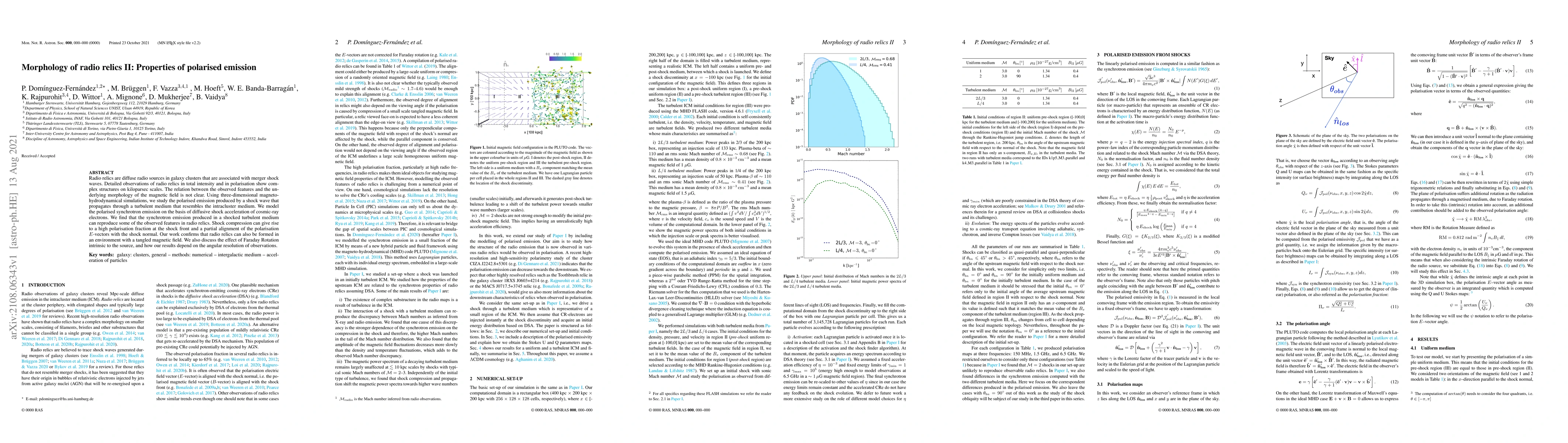 This paper investigates the morphology of radio relics in galaxy clusters using magneto-hydrodynamical simulations, finding that shock waves in turbulent mediums can reproduce observed features in polarised synchrotron emission. The study confirms that radio relics can form in environments with tangled magnetic fields, highlighting the impact of Faraday rotation and observational resolution.