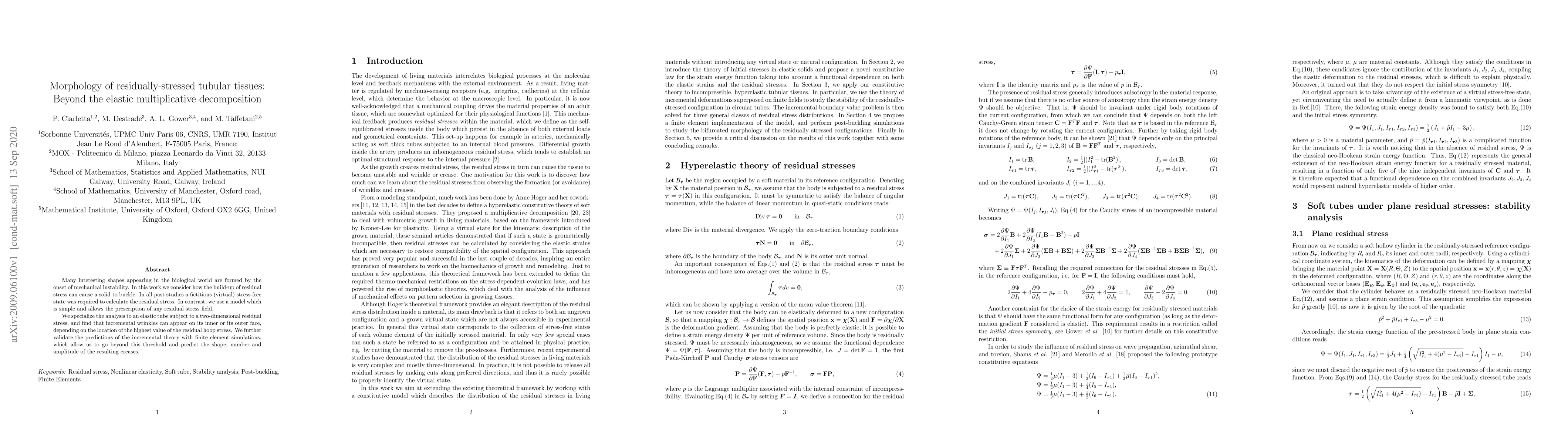 Many interesting shapes appearing in the biological world are formed by the onset of mechanical instability. In this work we consider how the build-up of residual stress can cause a solid to buckle. In all past studies a fictitious (virtual) stress-free state was required to calculate the residual stress. In contrast, we use a model which is simple and allows the prescription of any residual stress field. We specialize the analysis to an elastic tube subject to a two-dimensional residual stress, and find that incremental wrinkles can appear on its inner or its outer face, depending on the location of the highest value of the residual hoop stress. We further validate the predictions of the incremental theory with finite element simulations, which allow us to go beyond this threshold and predict the shape, number and amplitude of the resulting creases.
