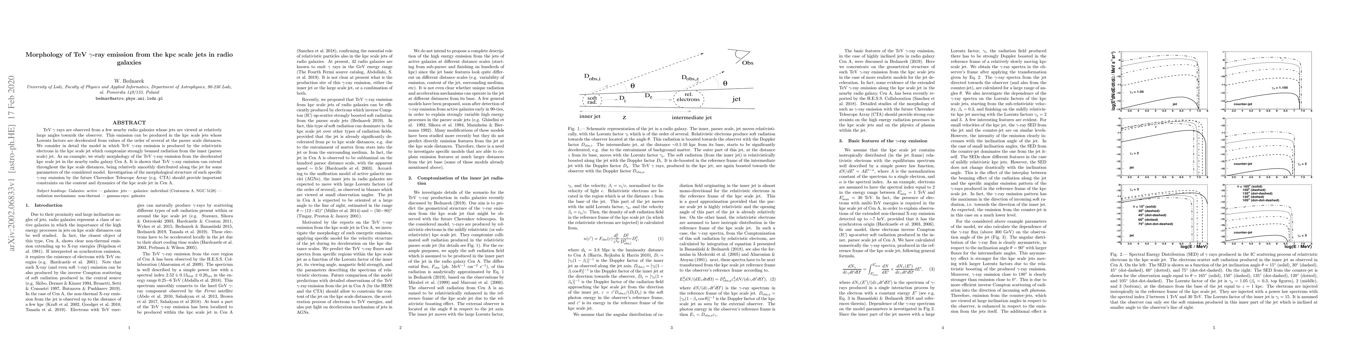This paper investigates the morphology of TeV gamma-ray emission from kpc scale jets in nearby radio galaxies, proposing that relativistic electrons in these jets produce the emission through strong Compton scattering of inner jet radiation. The study highlights the potential of the Cherenkov Telescope Array to reveal the morphological structure of such emissions, offering insights into the dynamics of jets in radio galaxies like Cen~A.