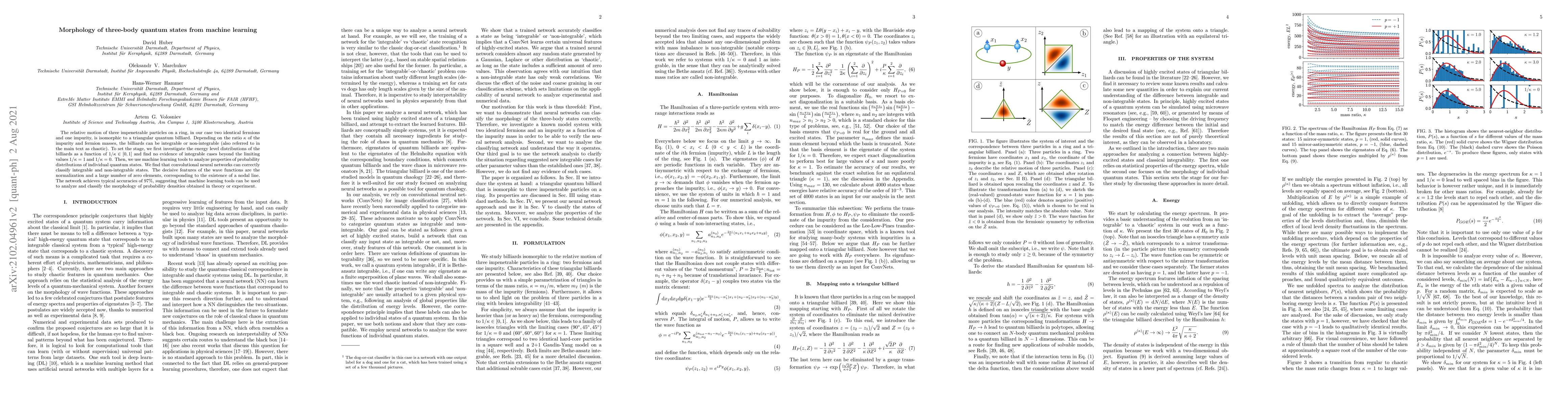 Machine learning can accurately classify three-body quantum states based on their morphology, with 97% accuracy, and reveals a correlation between the impurity mass ratio and state integrability.