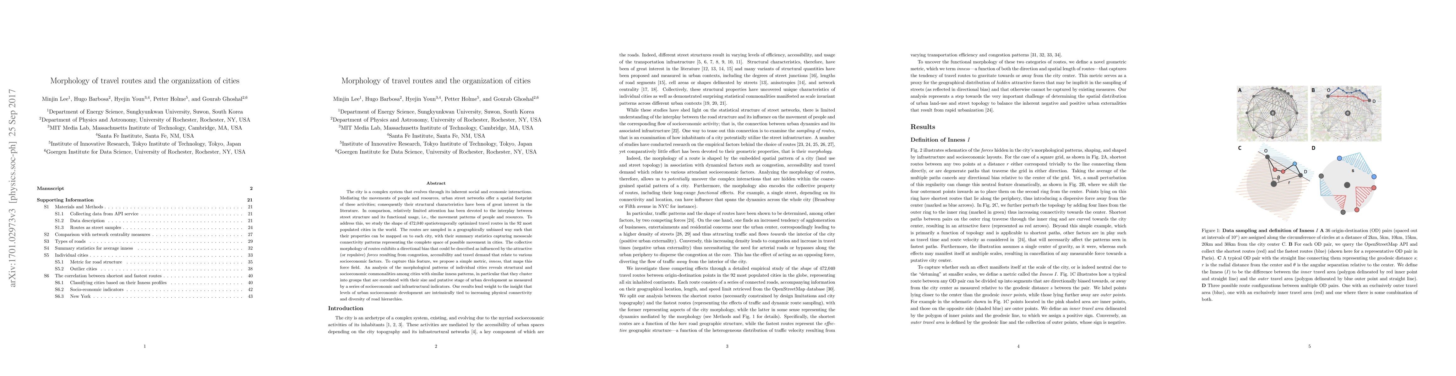 The city is a complex system that evolves through its inherent social and economic interactions. Mediating the movements of people and resources, urban street networks offer a spatial footprint of these activities; consequently their structural characteristics have been of great interest in the literature. In comparison, relatively limited attention has been devoted to the interplay between street structure and its functional usage, i.e., the movement patterns of people and resources. To address this, we study the shape of 472,040 spatiotemporally optimized travel routes in the 92 most populated cities in the world. The routes are sampled in a geographically unbiased way such that their properties can be mapped on to each city, with their summary statistics capturing mesoscale connectivity patterns representing the complete space of possible movement in cities. The collective morphology of routes exhibits a directional bias that could be described as influenced by the attractive (or repulsive) forces resulting from congestion, accessibility and travel demand that relate to various socioeconomic factors. To capture this feature, we propose a simple metric, inness, that maps this force field. An analysis of the morphological patterns of individual cities reveals structural and socioeconomic commonalities among cities with similar inness patterns, in particular that they cluster into groups that are correlated with their size and putative stage of urban development as measured by a series of socioeconomic and infrastructural indicators. Our results lend weight to the insight that levels of urban socioeconomic development are intrinsically tied to increasing physical connectivity and diversity of road hierarchies.