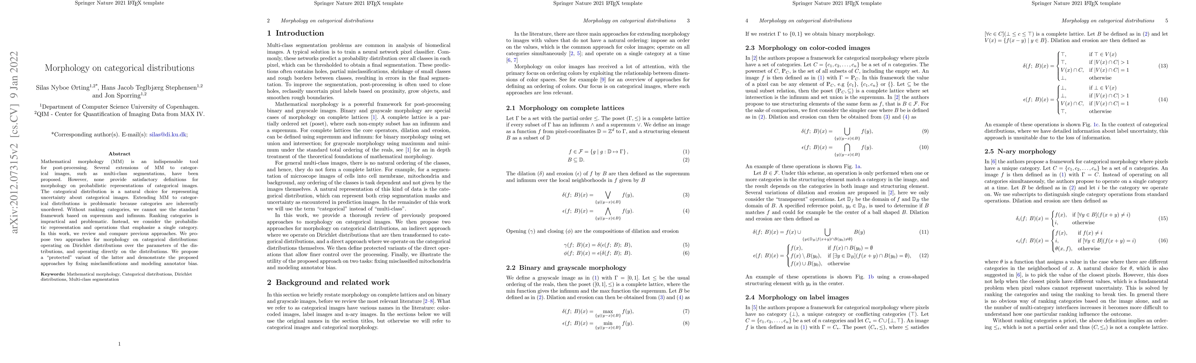 This paper establishes a framework for applying morphological operations to categorical distributions, which represent uncertainty in multi-class segmentations. It defines new operators that respect the probabilistic nature of these distributions and demonstrates their utility in modeling annotator bias in brain tumor segmentations and segmenting vesicle instances.
