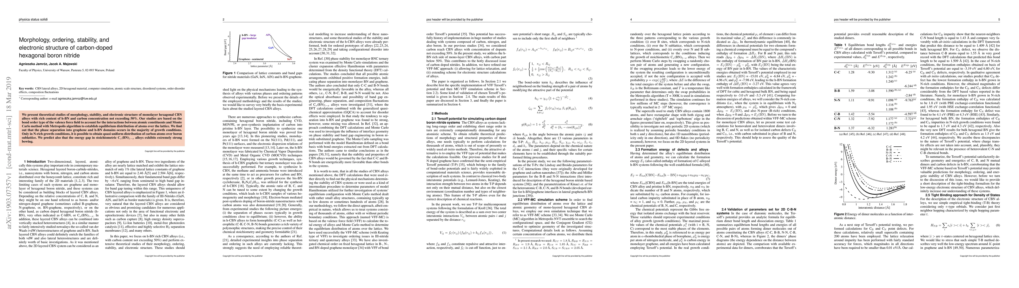 The study explores the morphology, stability, and electronic structure of carbon-doped hexagonal boron nitride alloys, finding phase separation into graphene and h-BN domains and strong bowing in energy gaps for stoichiometric CBN alloys.