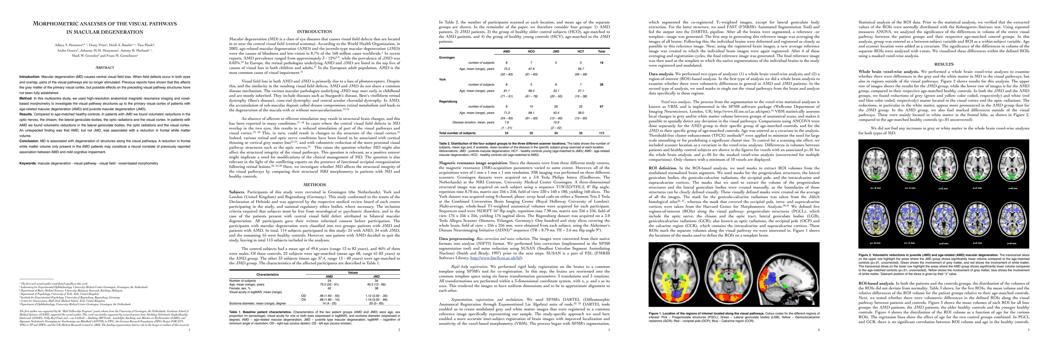 Introduction. Macular degeneration (MD) causes central visual field loss. When field defects occur in both eyes and overlap, parts of the visual pathways are no longer stimulated. Previous reports have shown that this affects the grey matter of the primary visual cortex, but possible effects on the preceding visual pathway structures have not been fully established. Method. In this multicentre study, we used high-resolution anatomical magnetic resonance imaging and voxel-based morphometry to investigate the visual pathway structures up to the primary visual cortex of patients with age-related macular degeneration (AMD) and juvenile macular degeneration (JMD). Results. Compared to age-matched healthy controls, in patients with JMD we found volumetric reductions in the optic nerves, the chiasm, the lateral geniculate bodies, the optic radiations and the visual cortex. In patients with AMD we found volumetric reductions in the lateral geniculate bodies, the optic radiations and the visual cortex. An unexpected finding was that AMD, but not JMD, was associated with a reduction in frontal white matter volume. Conclusion. MD is associated with degeneration of structures along the visual pathways. A reduction in frontal white matter volume only present in the AMD patients may constitute a neural correlate of previously reported association between AMD and mild cognitive impairment. Keywords: macular degeneration - visual pathway - visual field - voxel-based morphometry