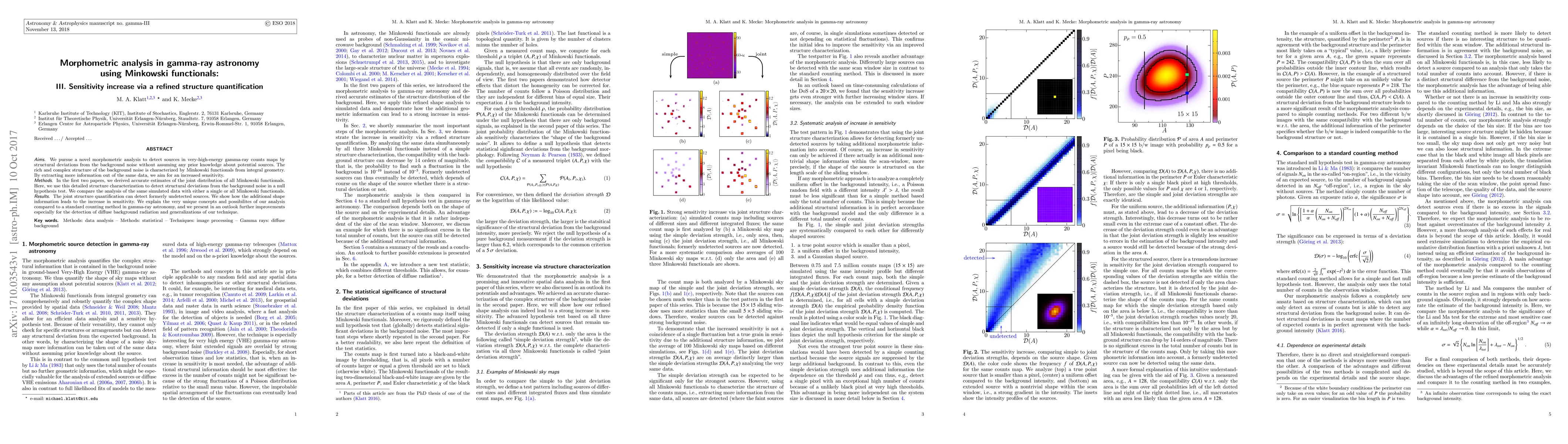 We pursue a novel morphometric analysis to detect sources in very-high-energy gamma-ray counts maps by structural deviations from the background noise without assuming any prior knowledge about potential sources. The rich and complex structure of the background noise is characterized by Minkowski functionals from integral geometry. By extracting more information out of the same data, we aim for an increased sensitivity. In the first two papers, we derived accurate estimates of the joint distribution of all Minkowski functionals. Here, we use this detailed structure characterization to detect structural deviations from the background noise in a null hypothesis test. We compare the analysis of the same simulated data with either a single or all Minkowski functionals. The joint structure quantification can detect formerly undetected sources. We show how the additional shape information leads to the increase in sensitivity. We explain the very unique concepts and possibilites of our analysis compared to a standard counting method in gamma-ray astronomy, and we present in an outlook further improvements especially for the detection of diffuse background radiation and generalizations of our technique.