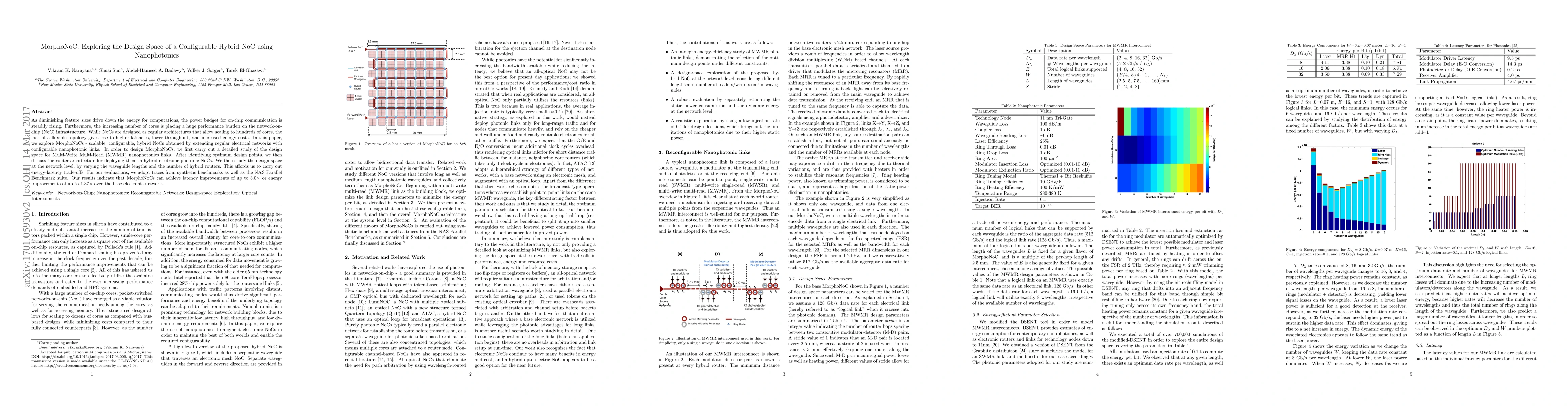 The paper proposes MorphoNoCs, scalable and configurable hybrid NoCs that integrate nanophotonics with regular electrical networks to address NoC performance and energy issues. Through detailed design space exploration of Multi-Write Multi-Read (MWMR) nanophotonics links and network-level studies, MorphoNoCs demonstrate latency improvements of up to 3.0x and energy savings of up to 1.37x compared to conventional electronic networks.