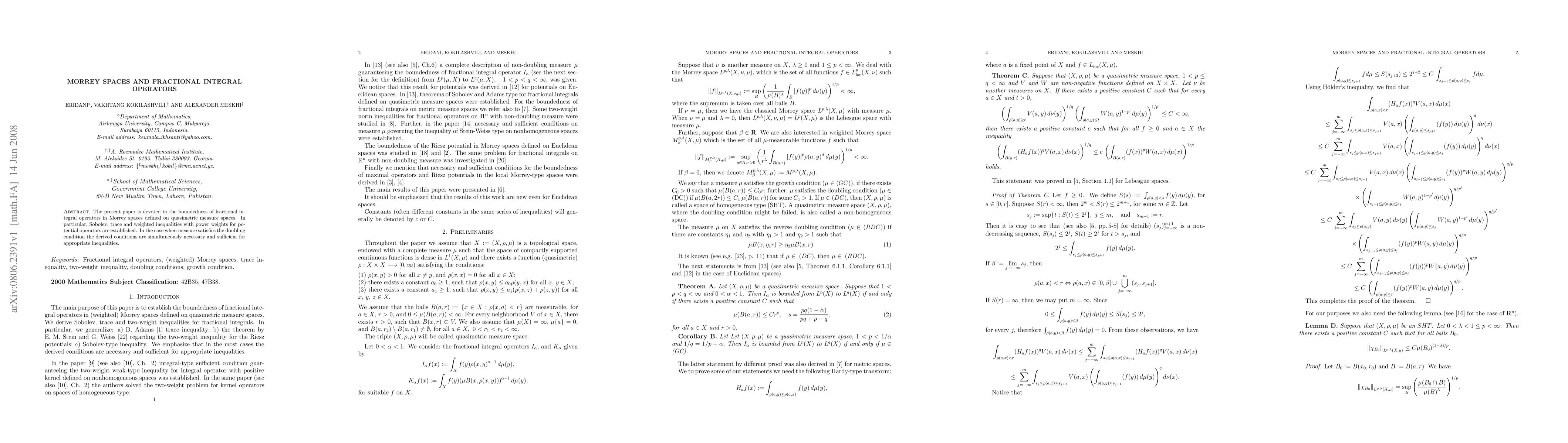 Summary: This paper investigates the boundedness of fractional integral operators within Morrey spaces on quasimetric measure spaces, establishing Sobolev, trace, and weighted inequalities. When the measure fulfills the doubling condition, the derived conditions are both necessary and sufficient for the relevant inequalities.