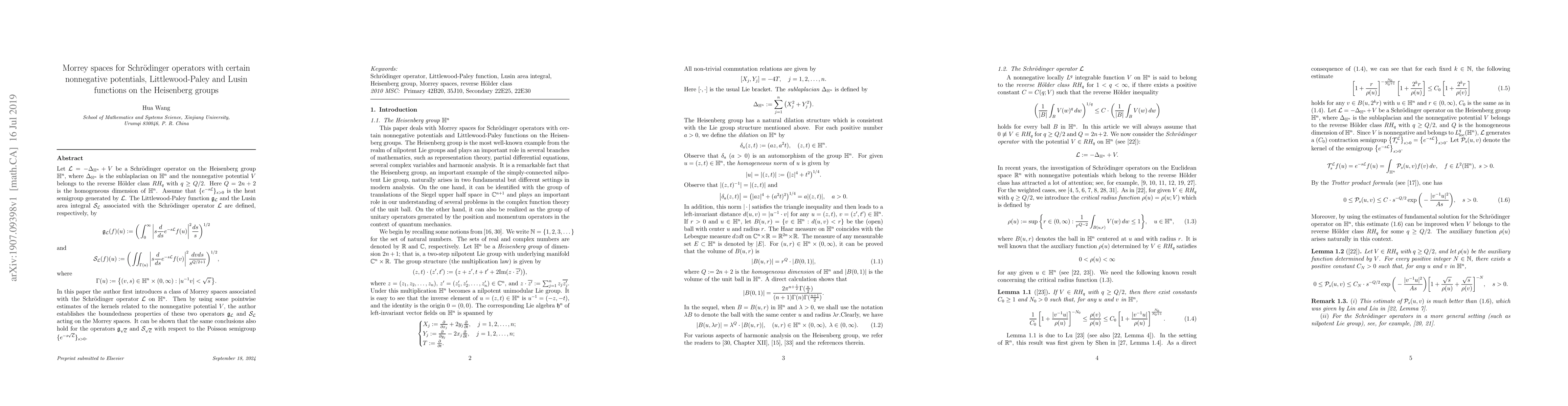 This paper introduces Morrey spaces for Schr"odinger operators on the Heisenberg group and establishes boundedness properties of Littlewood-Paley and Lusin functions on these spaces, with implications for heat semigroups and Poisson semigroups.