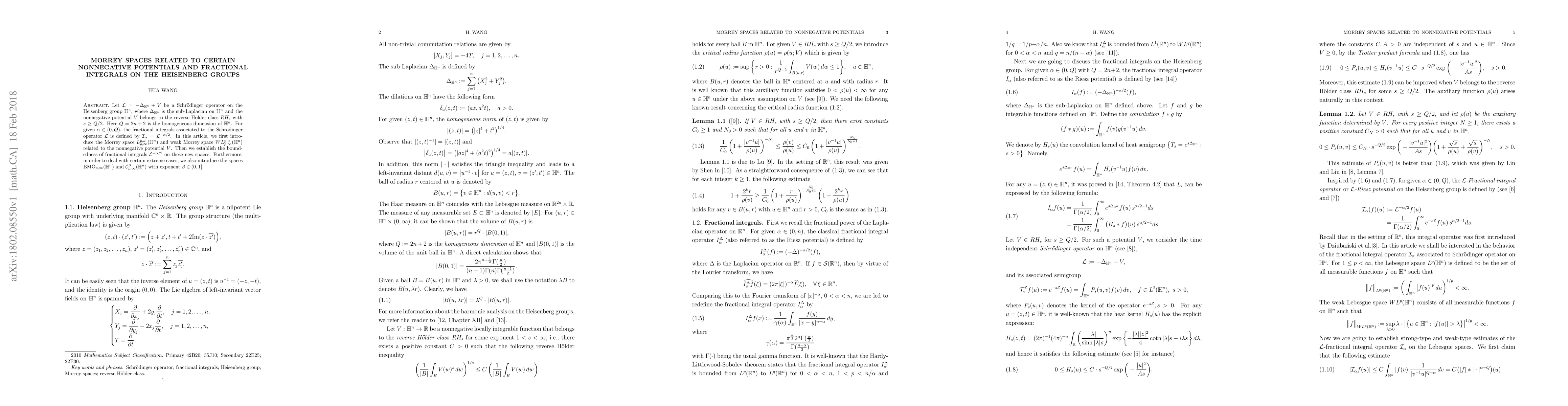 This paper investigates the properties of Morrey spaces and fractional integrals on the Heisenberg group, establishing bounds for these operators on newly defined spaces related to nonnegative potentials and fractional integrals.