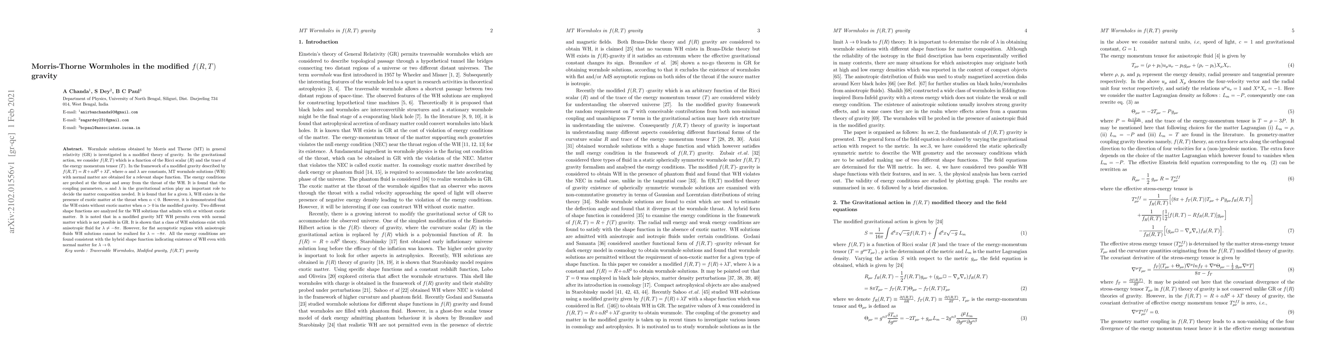 We study static traversable wormholes obtained by Morris and Thorne in general relativity (GR) in the framework of a modified theory of gravity. The modified gravitational action $f(R,T)$ is a function of the Ricci scalar ($R$) and of the trace of the energy momentum tensor ($T$). For a modified gravity $f(R,T)=R+\alpha R^{2}+\lambda T$, where $\alpha$ and $\lambda$ are constants, we obtain wormhole solutions (WH) with normal matter for a relevant shape functions. The energy conditions are checked at the throat and away from the throat of the WH. The coupling parameters $\alpha $ and $\lambda$ in the gravitational action play an important role to accommodate the matter composition. For a given $\lambda$, WH solutions are found in the presence of exotic matter at the throat for $\alpha <0$. It is shown that WH exists in the modified gravity without exotic matter when $\alpha >0$. We consider two different shape functions to investigate the existence of WH in the presence of exotic or normal matter. A class of WH solutions exist with anisotropic fluid provided $\lambda \neq - 8 \pi$. In flat asymptotic regions on both sides of the throat with anisotropic source and $\lambda= - 8 \pi$, it does not permit WH as per no go theorem. As $\lambda \rightarrow 0$ in the gravitational action, all the energy conditions are obeyed with the hybrid shape function indicating existence of WH with normal matter.