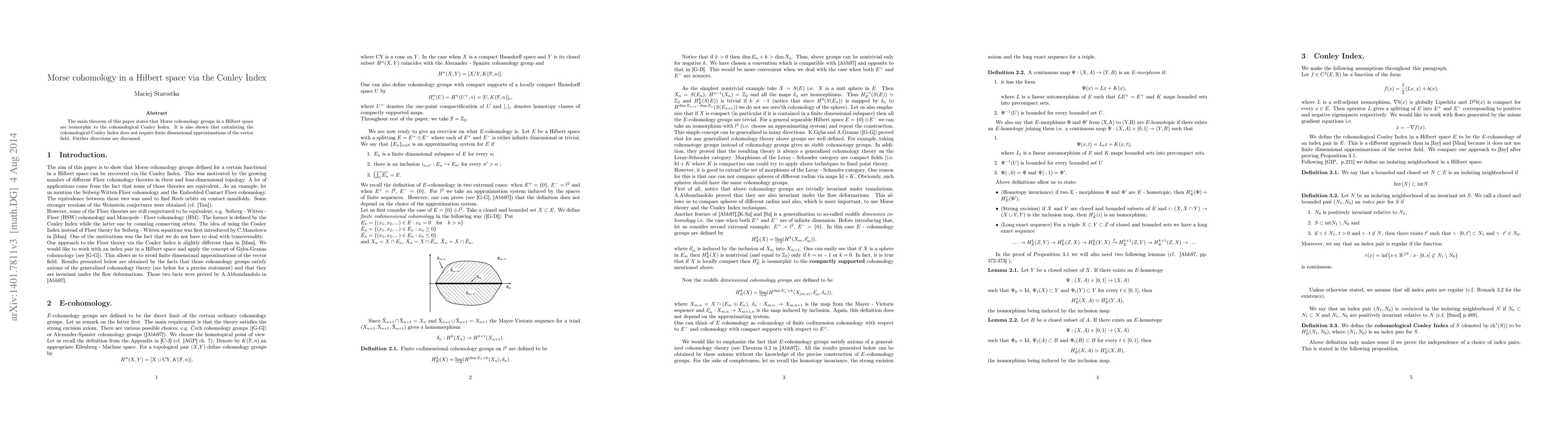 This paper demonstrates that Floer cohomology groups in a Hilbert space are isomorphic to the cohomological Conley Index, and highlights that calculating the cohomological Conley Index does not necessitate finite-dimensional approximations of the vector field. Future research directions are also outlined.
