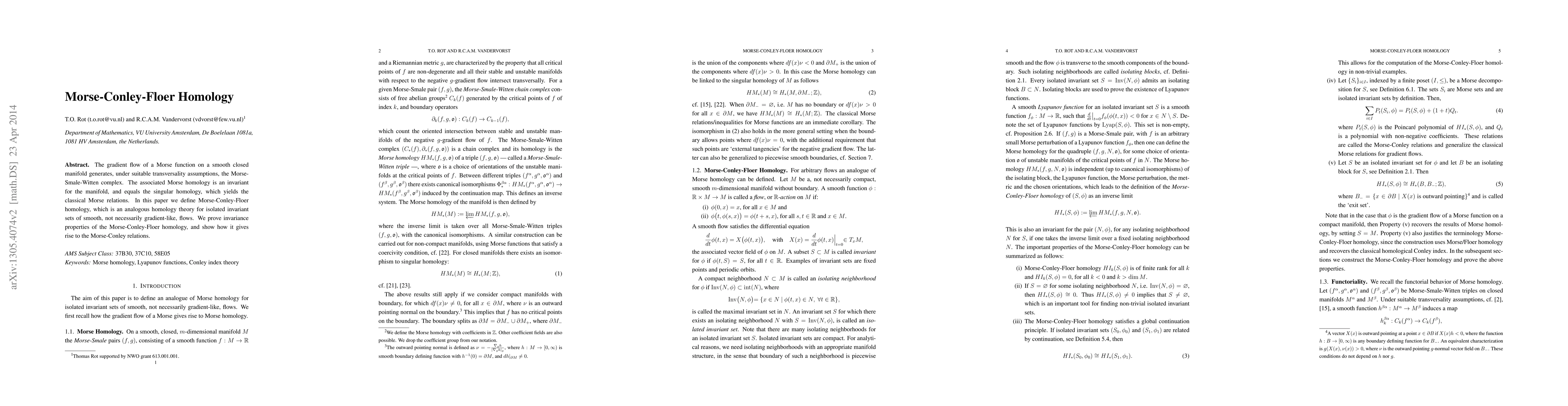 For Morse-Smale pairs on a smooth, closed manifold the Morse-Smale-Witten chain complex can be defined. The associated Morse homology is isomorphic to the singular homology of the manifold and yields the classical Morse relations for Morse functions. A similar approach can be used to define homological invariants for isolated invariant sets of flows on a smooth manifold, which gives an analogue of the Conley index and the Morse-Conley relations. The approach will be referred to as Morse-Conley-Floer homology.