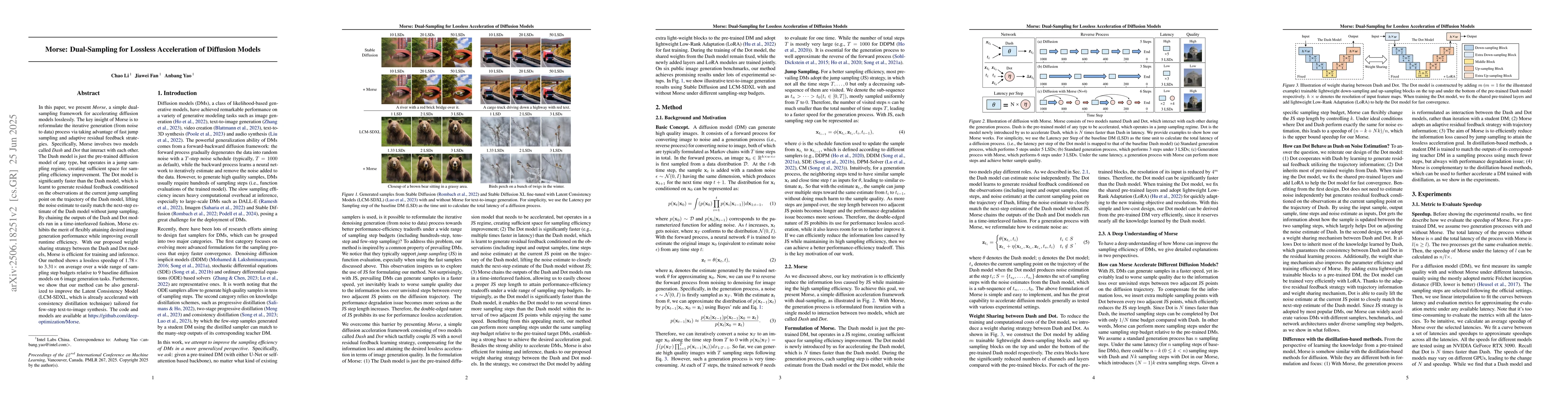In this paper, we present Morse, a simple dual-sampling framework for accelerating diffusion models losslessly. The key insight of Morse is to reformulate the iterative generation (from noise to data) process via taking advantage of fast jump sampling and adaptive residual feedback strategies. Specifically, Morse involves two models called Dash and Dot that interact with each other. The Dash model is just the pre-trained diffusion model of any type, but operates in a jump sampling regime, creating sufficient space for sampling efficiency improvement. The Dot model is significantly faster than the Dash model, which is learnt to generate residual feedback conditioned on the observations at the current jump sampling point on the trajectory of the Dash model, lifting the noise estimate to easily match the next-step estimate of the Dash model without jump sampling. By chaining the outputs of the Dash and Dot models run in a time-interleaved fashion, Morse exhibits the merit of flexibly attaining desired image generation performance while improving overall runtime efficiency. With our proposed weight sharing strategy between the Dash and Dot models, Morse is efficient for training and inference. Our method shows a lossless speedup of 1.78X to 3.31X on average over a wide range of sampling step budgets relative to 9 baseline diffusion models on 6 image generation tasks. Furthermore, we show that our method can be also generalized to improve the Latent Consistency Model (LCM-SDXL, which is already accelerated with consistency distillation technique) tailored for few-step text-to-image synthesis. The code and models are available at https://github.com/deep-optimization/Morse.