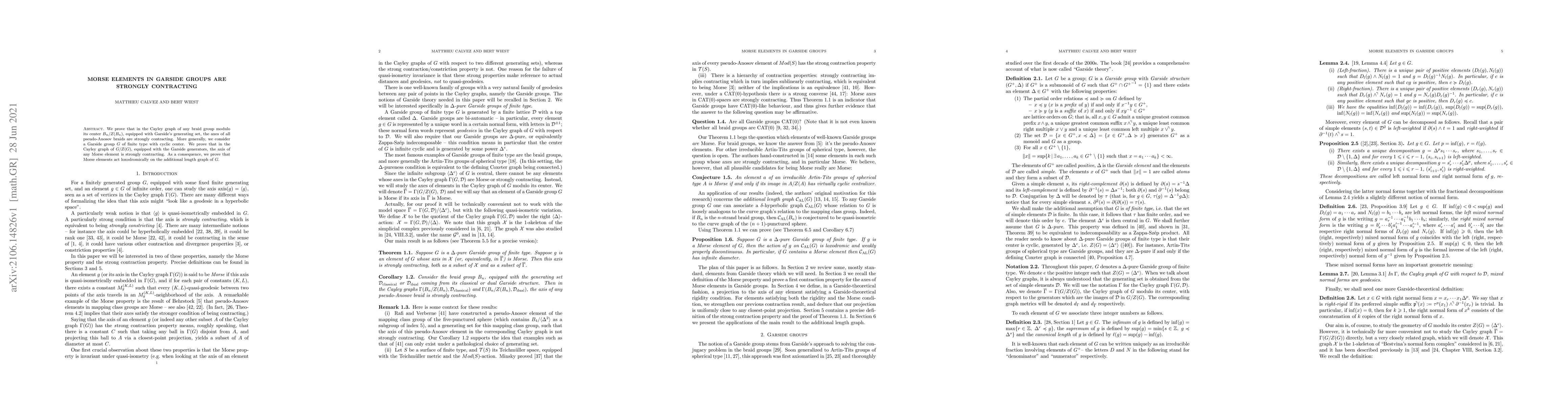 We prove that in the Cayley graph of any braid group modulo its center $B_n/Z(B_n)$, equipped with Garside's generating set, the axes of all pseudo-Anosov braids are strongly contracting. More generally, we consider a Garside group $G$ of finite type with cyclic center. We prove that in the Cayley graph of $G/Z(G)$, equipped with the Garside generators, the axis of any Morse element is strongly contracting. As a consequence, we prove that Morse elements act loxodromically on the additional length graph of $G$.