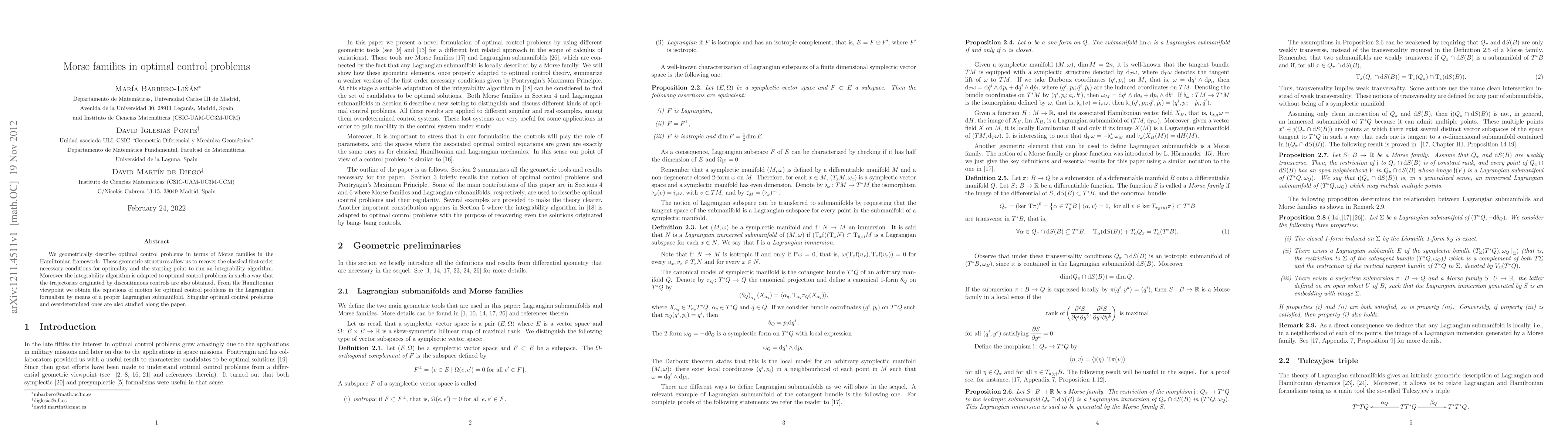 Researchers describe optimal control problems using Morse families in Hamiltonian framework, enabling recovery of classical first-order necessary conditions for optimality and adaptation of integrability algorithms.