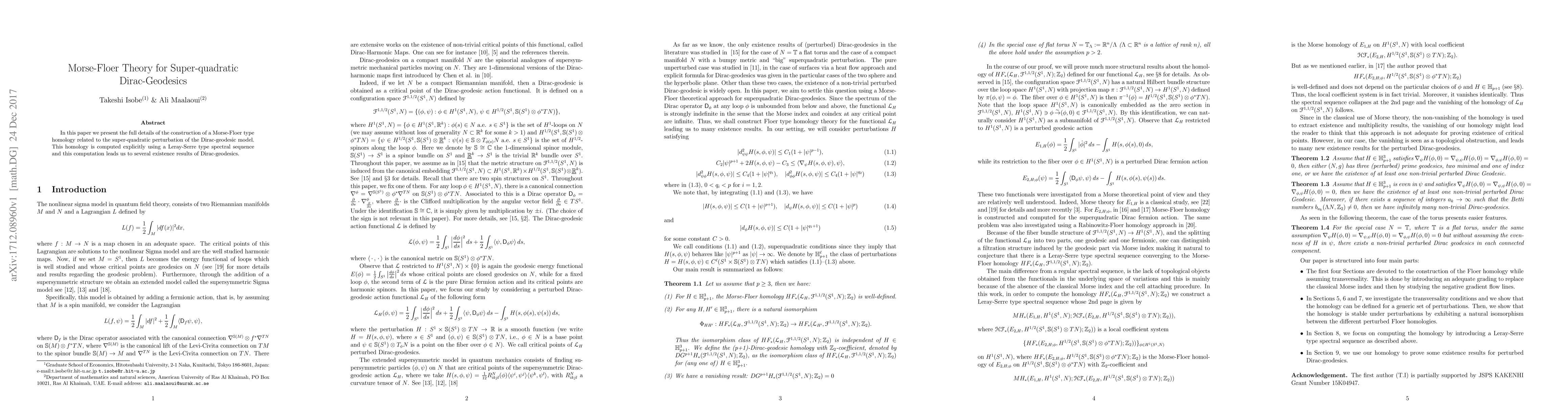 This paper constructs a Morse-Floer homology for super-quadratic perturbations of the Dirac-geodesic model, utilizing a Leray-Serre spectral sequence for explicit computation, which yields existence results for Dirac-geodesics.