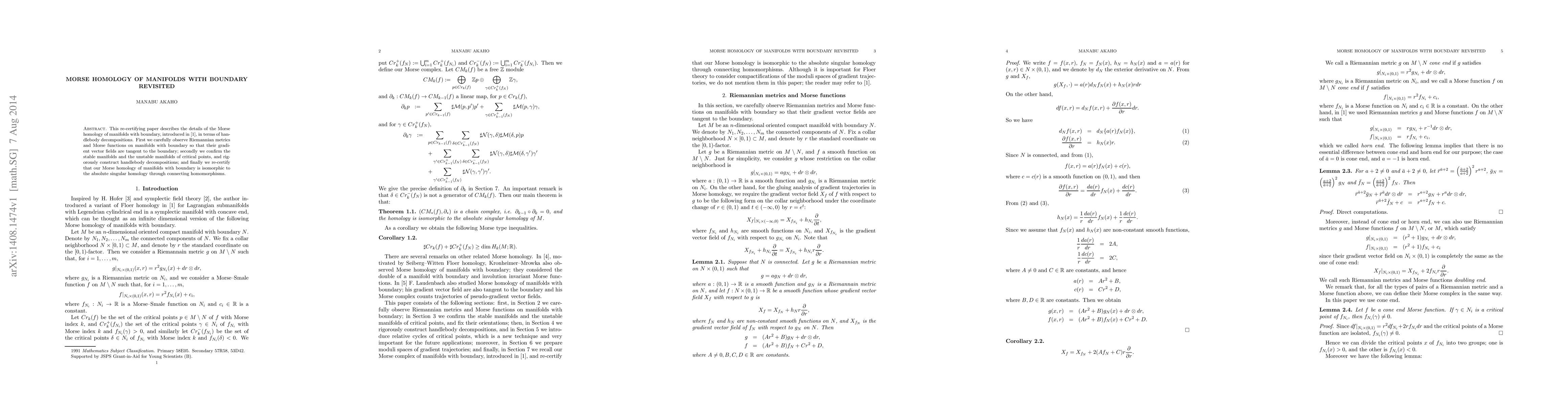 This re-certifying paper describes the details of the Morse homology of manifolds with boundary, introduced by the author before, in terms of handlebody decompositions.