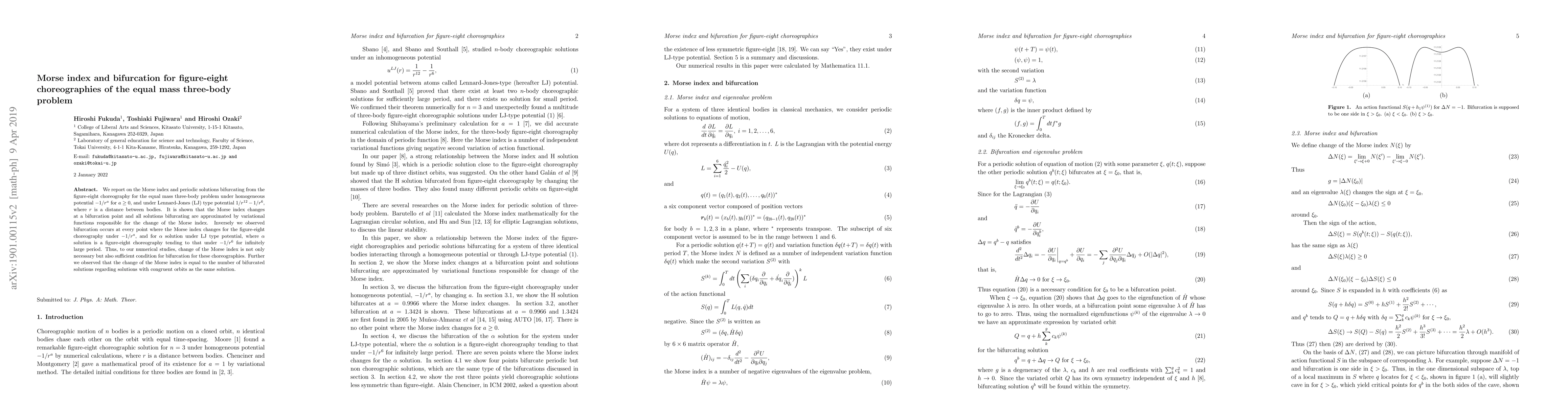 This paper investigates the Morse index and bifurcation phenomena in the periodic solutions of the equal mass three-body problem, specifically focusing on figure-eight choreographies. It demonstrates that bifurcations occur at points where the Morse index changes, and the number of bifurcated solutions corresponds to the change in the Morse index.