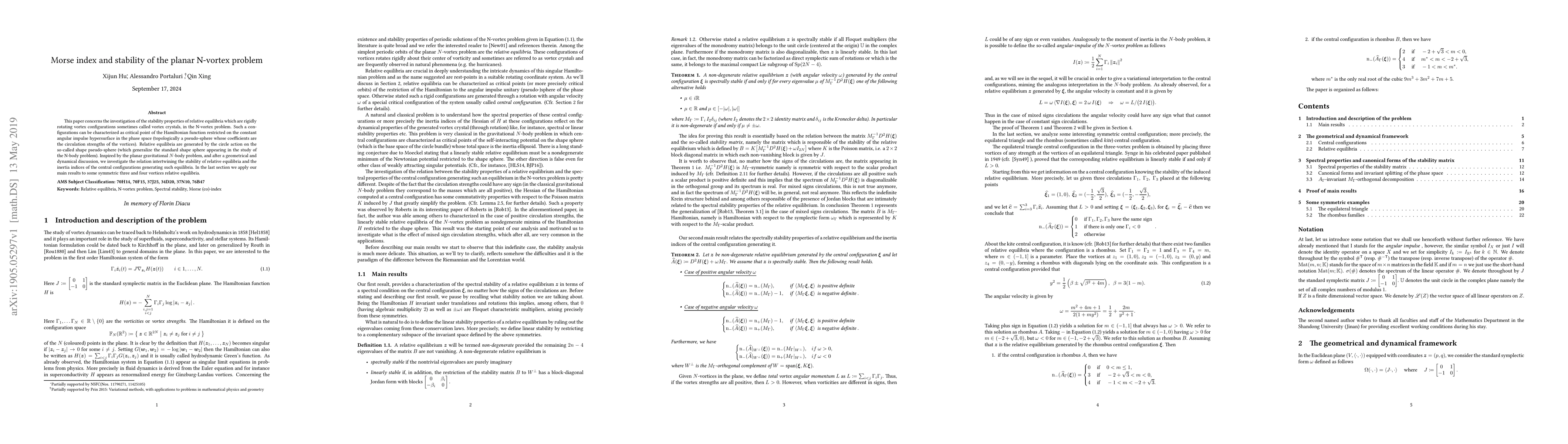 This paper investigates the stability of rigidly rotating vortex configurations, termed vortex crystals, in the planar N-vortex problem, linking their stability to the Morse index of the Hamiltonian function. It applies the findings to symmetric three and four vortex configurations.