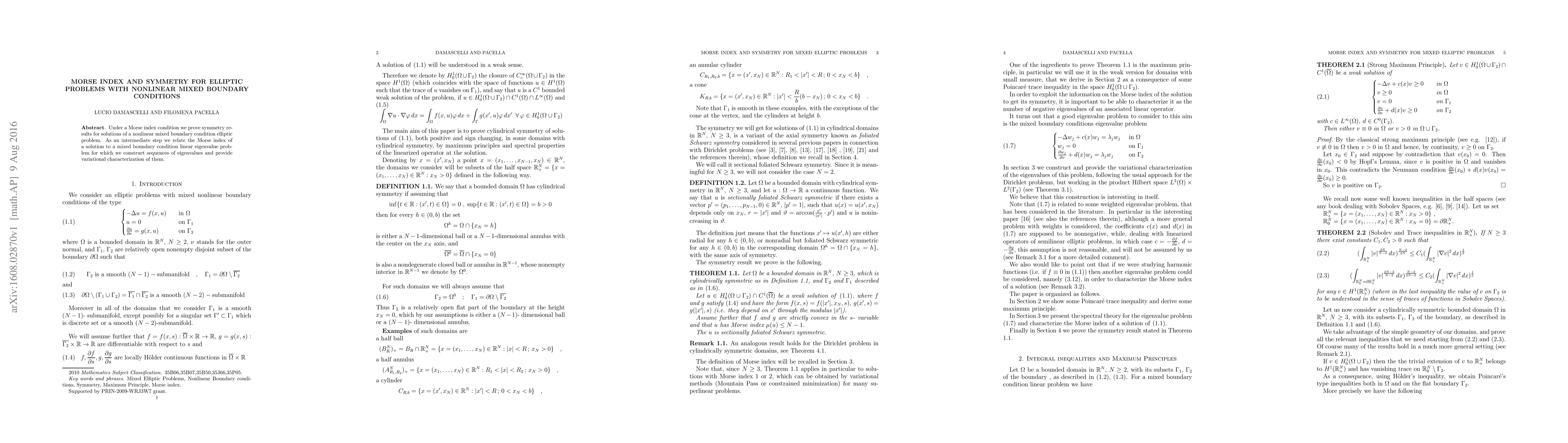 This paper proves symmetry results for solutions of a nonlinear elliptic problem with mixed boundary conditions under a Morse index condition. It also constructs sequences of eigenvalues and provides a variational characterization for a related linear eigenvalue problem.
