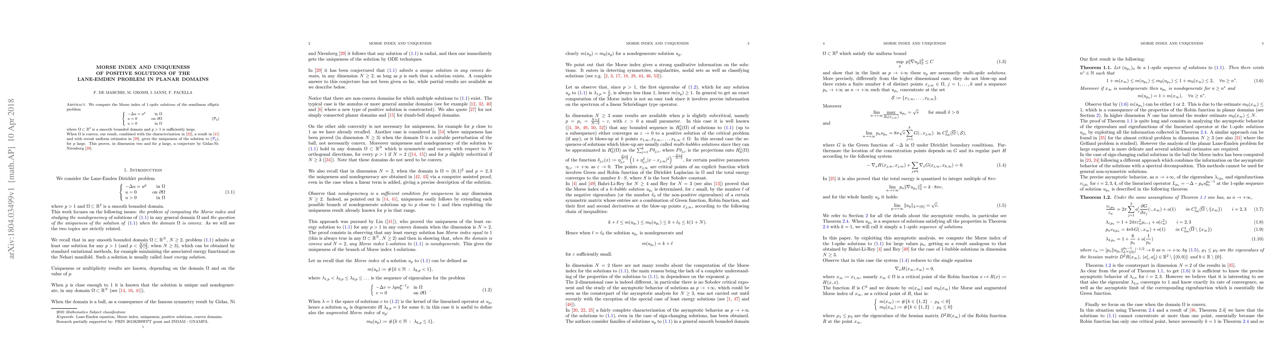 We compute the Morse index of $1$-spike solutions of the semilinear elliptic problem \begin{equation}\label{abstr} \tag{$\mathcal P_p$} \begin{cases} -\Delta u= u^p & \text{in $\Omega$} \\ u=0 & \text{on $\partial\Omega$} \\ u>0 & \text{in $\Omega$.} \end{cases} \end{equation} where $\Omega\subset \mathbb{R}^2$ is a smooth bounded domain and $p>1$ is sufficiently large. When $\Omega$ is convex, our result, combined with the characterization in [22], a result in [41] and with recent uniform estimates in \cite{Sirakov}, gives the uniqueness of the solution to \eqref{abstr}, for $p$ large. This proves, in dimension two and for $p$ large, a conjecture by Gidas-Ni-Nirenberg [29].