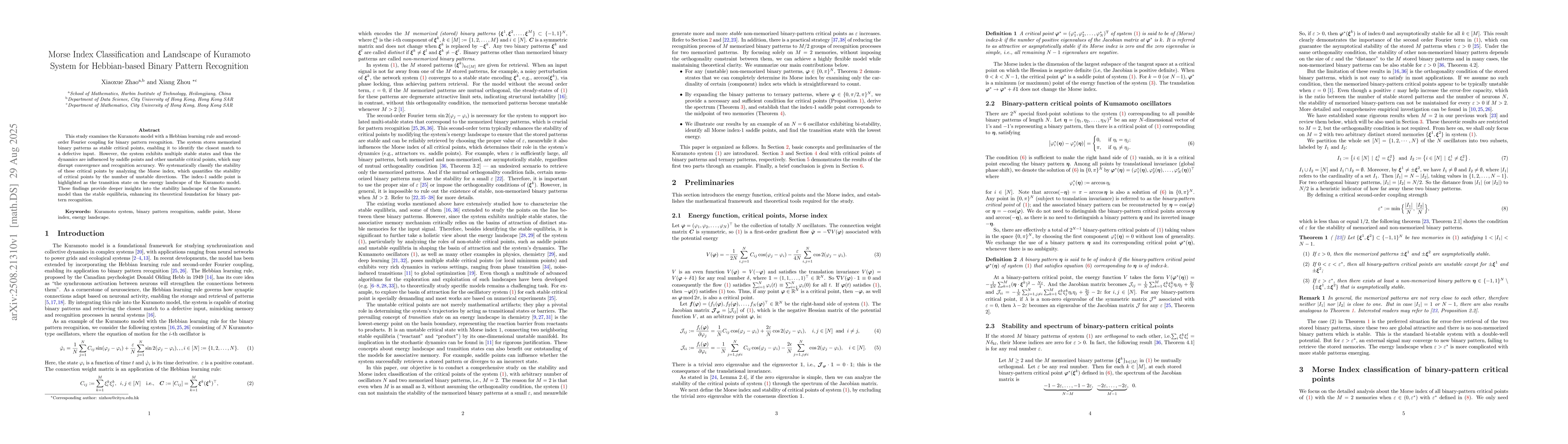 This study examines the Kuramoto model with a Hebbian learning rule and second-order Fourier coupling for binary pattern recognition. The system stores memorized binary patterns as stable critical points, enabling it to identify the closest match to a defective input. However, the system exhibits multiple stable states and thus the dynamics are influenced by saddle points and other unstable critical points, which may disrupt convergence and recognition accuracy. We systematically classify the stability of these critical points by analyzing the Morse index, which quantifies the stability of critical points by the number of unstable directions. The index-1 saddle point is highlighted as the transition state on the energy landscape of the Kuramoto model. These findings provide deeper insights into the stability landscape of the Kuramoto model than the stable equilibria, enhancing its theoretical foundation for binary pattern recognition.