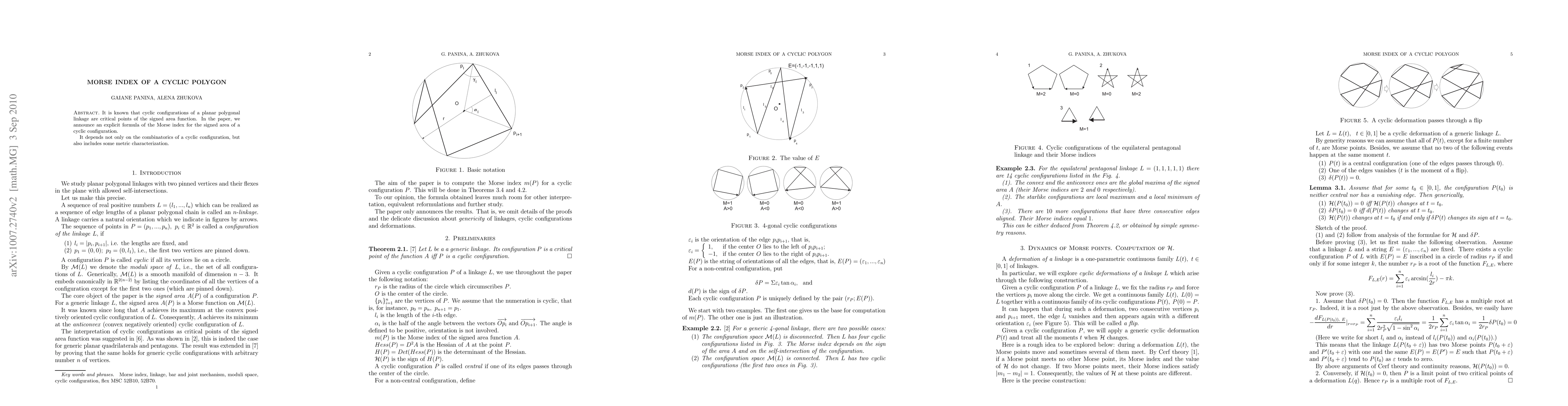It is known that cyclic configurations of a planar polygonal linkage are critical points of the signed area function. In the paper, we announce an explicit formula of the Morse index for the signed area of a cyclic configuration. It depends not only on the combinatorics of a cyclic configuration, but also includes some metric characterization.