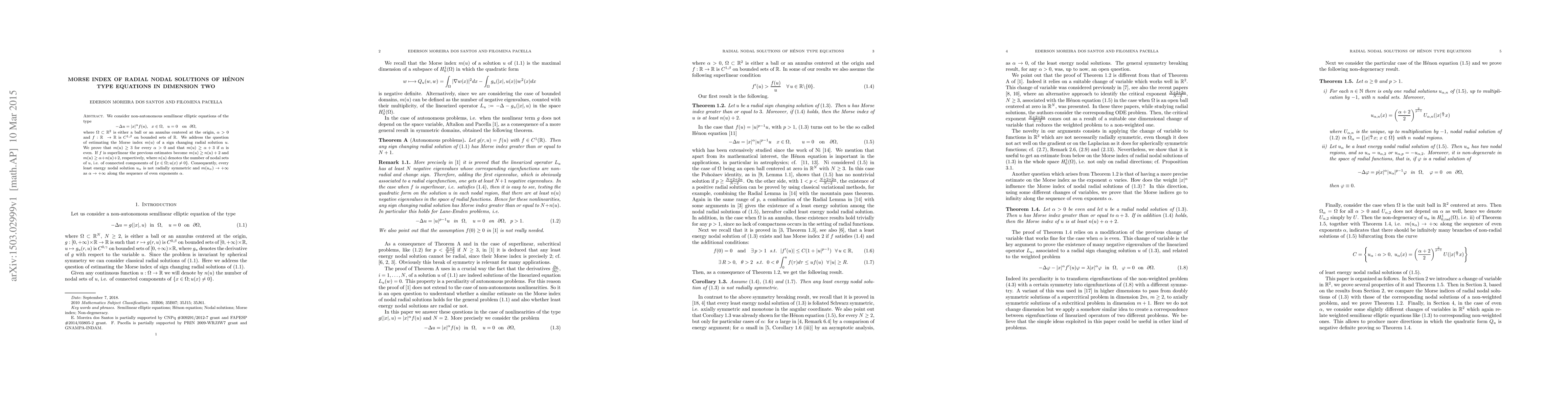 Research shows that non-autonomous semilinear elliptic equations in dimension two have radial nodal solutions with a Morse index of at least 3 or greater than the sum of alpha and the number of nodal sets, depending on the function f.