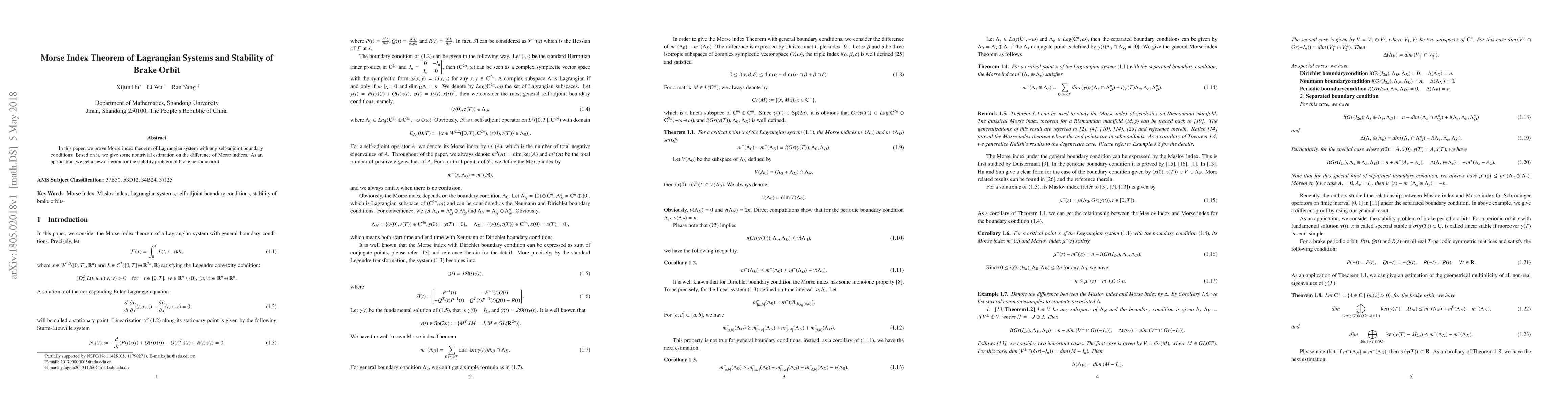 This paper proves the Morse index theorem for Lagrangian systems under self-adjoint boundary conditions and provides a new criterion for the stability of brake periodic orbits based on estimations of the difference in Morse indices.