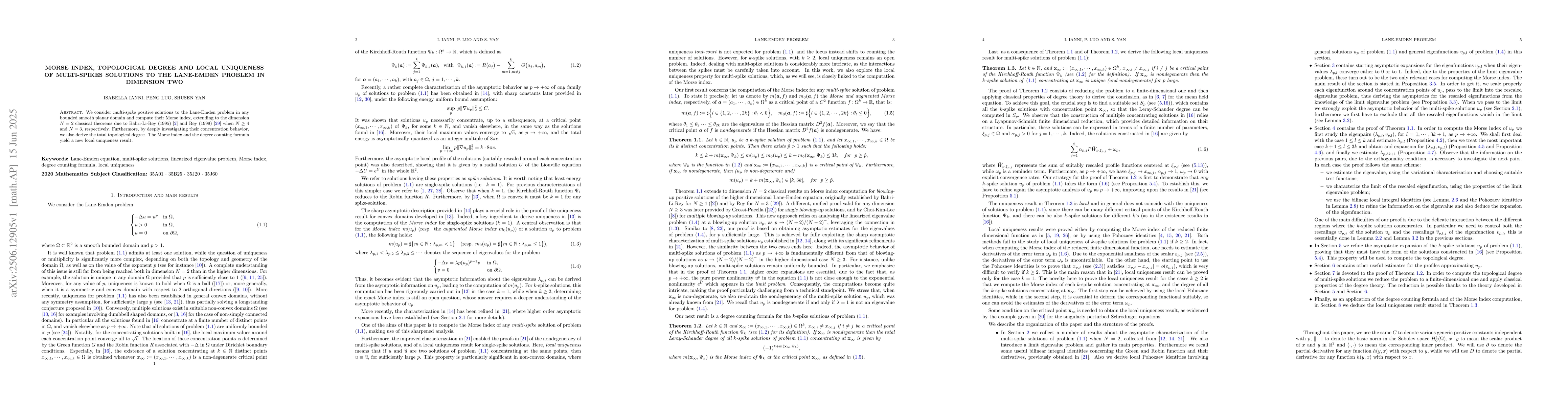 We consider multi-spike positive solutions to the Lane-Emden problem in any bounded smooth planar domain and compute their Morse index, extending to the dimension $N=2$ classical theorems due to Bahri-Li-Rey (1995) and Rey (1999) when $N\geq 4$ and $N=3$, respectively. Furthermore, by deeply investigating their concentration behavior, we also derive the total topological degree. The Morse index and the degree counting formula yield a new local uniqueness result.