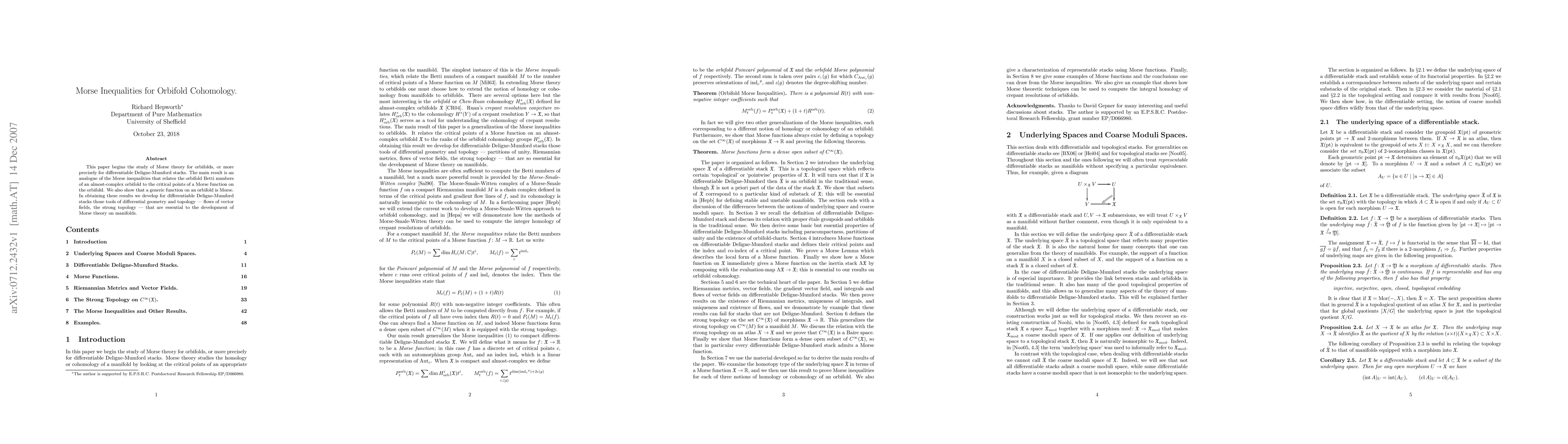 This paper begins the study of Morse theory for orbifolds, or more precisely for differentiable Deligne-Mumford stacks. The main result is an analogue of the Morse inequalities that relates the orbifold Betti numbers of an almost-complex orbifold to the critical points of a Morse function on the orbifold. We also show that a generic function on an orbifold is Morse. In obtaining these results we develop for differentiable Deligne-Mumford stacks those tools of differential geometry and topology -- flows of vector fields, the strong topology -- that are essential to the development of Morse theory on manifolds.