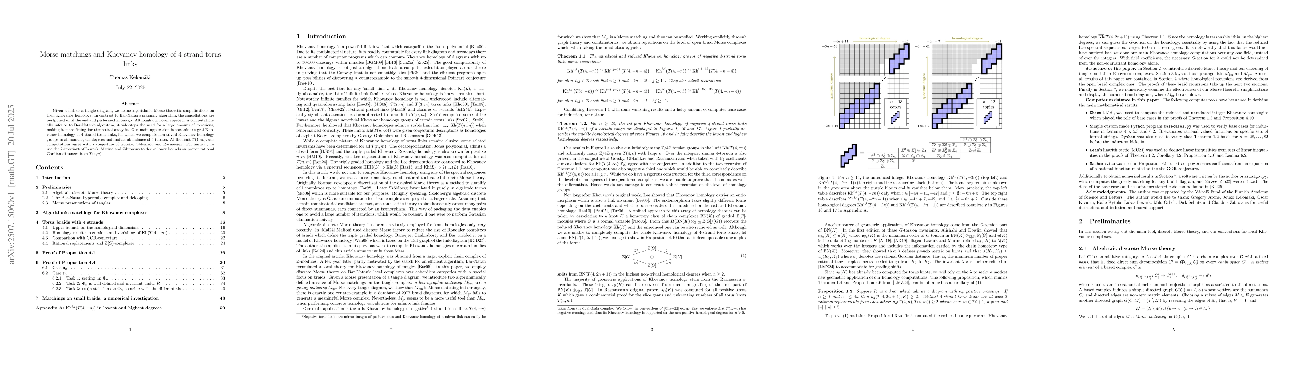 Given a link or a tangle diagram, we define algorithmic Morse theoretic simplifications on their Khovanov homology. In contrast to Bar-Natan's scanning algorithm, the cancellations are postponed until the end and performed in one go. Although our novel approach is computationally inferior to Bar-Natan's algorithm, it side-steps the need for a large amount of iterations, making it more fitting for theoretical analysis. Our main application is towards integral Khovanov homology of 4-strand torus links, for which we compute non-trivial Khovanov homology groups in all homological degrees and find an abundance of $4$-torsion. At the limit $T(4,\infty)$, our computations agree with a conjecture of Gorsky, Oblomkov and Rasmussen. For finite $n$, we use the $\lambda$-invariant of Lewark, Marino and Zibrowius to derive lower bounds on proper rational Gordian distances from $T(4,n)$.