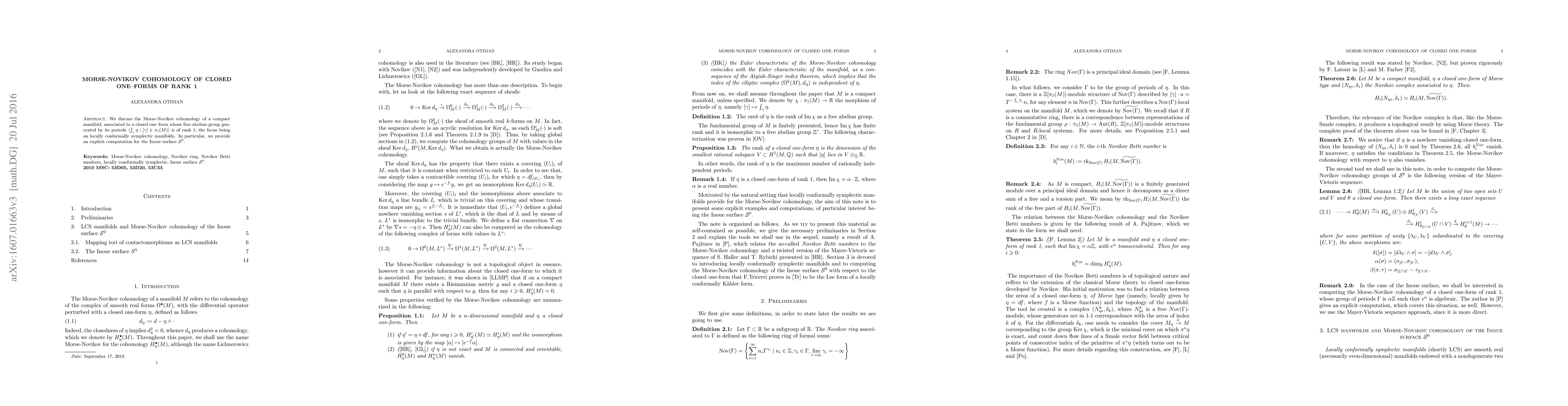 We discuss the Morse-Novikov cohomology of a compact manifold, associated to a closed one--form whose free abelian group generated by its periods $\langle \int_\gamma \eta \mid [\gamma] \in \pi_1(M)\rangle$ is of rank 1, the focus being on locally conformally symplectic manifolds. In particular, we provide an explicit computation for the Inoue surface $\mathcal{S}^0$.
