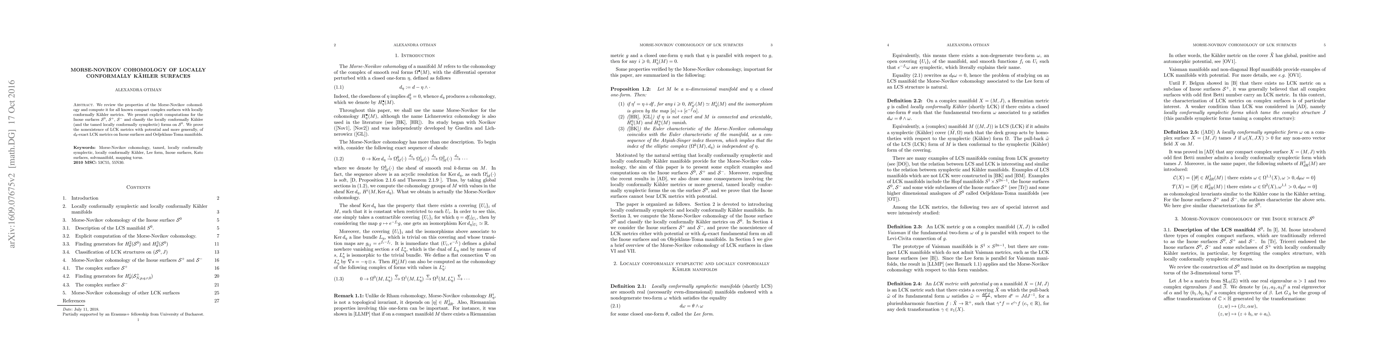 This paper reviews Morse-Novikov cohomology properties and computes them for compact complex surfaces with locally conformally Kähler metrics, focusing on Inoue surfaces $\mathcal{S}^0$, $\mathcal{S}^+$, $\mathcal{S}^-$. It classifies the locally conformally Kähler forms on $\mathcal{S}^0$ and proves the nonexistence of LCK metrics with potential on Inoue surfaces and Oeljeklaus-Toma manifolds.