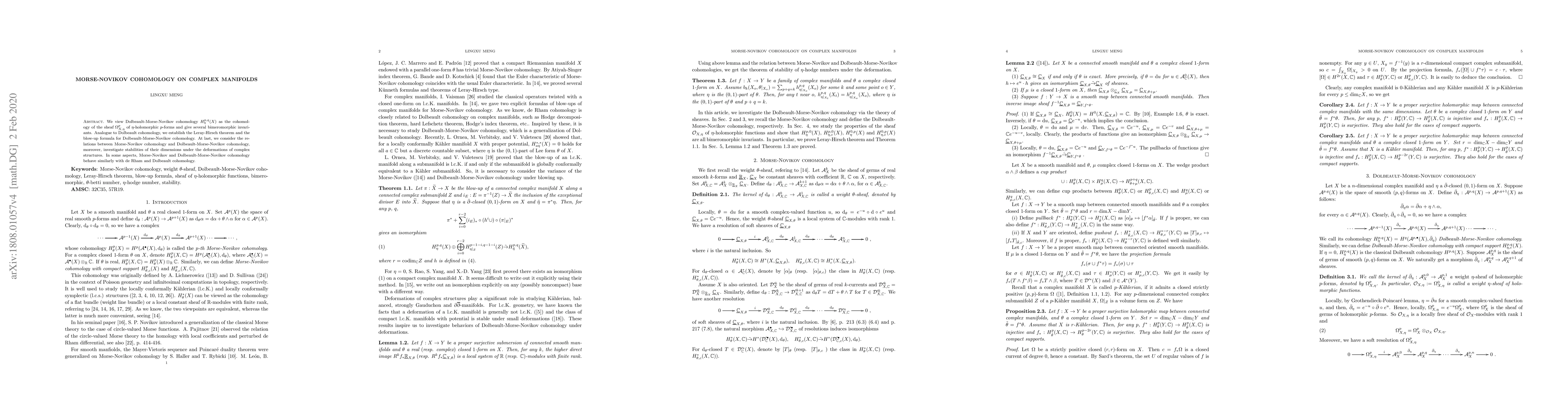 This paper explores Dolbeault-Morse-Novikov cohomology H^{p,q}_\eta(X), defining it via \eta-holomorphic p-forms and establishing invariants, analogous structures to Dolbeault cohomology, and investigates the stability of its dimensions under complex structure deformations, comparing it with de Rham and Dolbeault cohomologies.