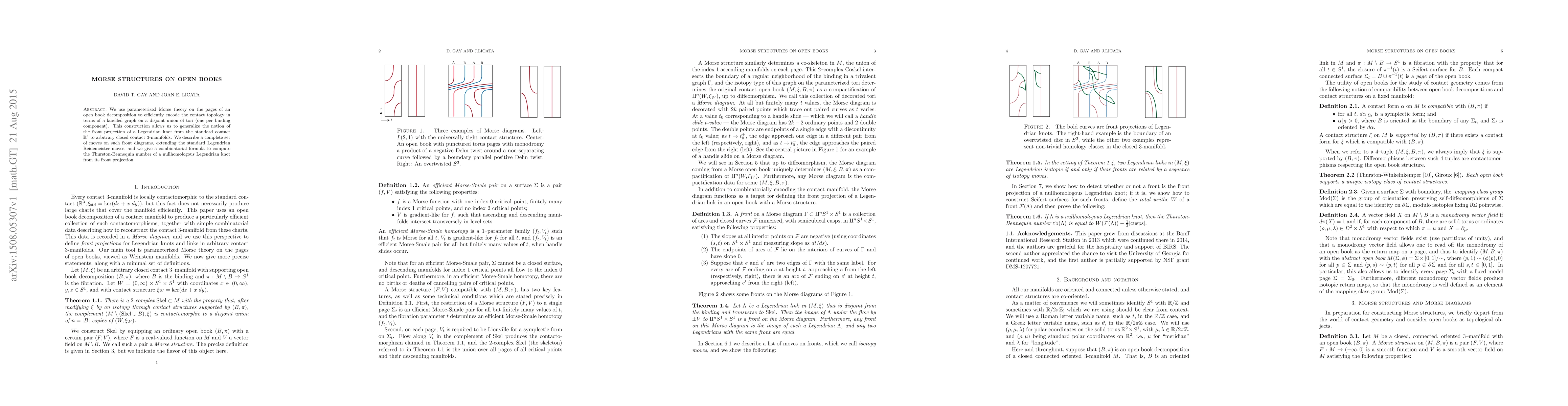 We use parameterized Morse theory on the pages of an open book decomposition to efficiently encode the contact topology in terms of a labelled graph on a disjoint union of tori (one per binding component). This construction allows us to generalize the notion of the front projection of a Legendrian knot from the standard contact $\mathbb{R}^3$ to arbitrary closed contact $3$-manifolds. We describe a complete set of moves on such front diagrams, extending the standard Legendrian Reidemeister moves, and we give a combinatorial formula to compute the Thurston-Bennequin number of a nullhomologous Legendrian knot from its front projection.