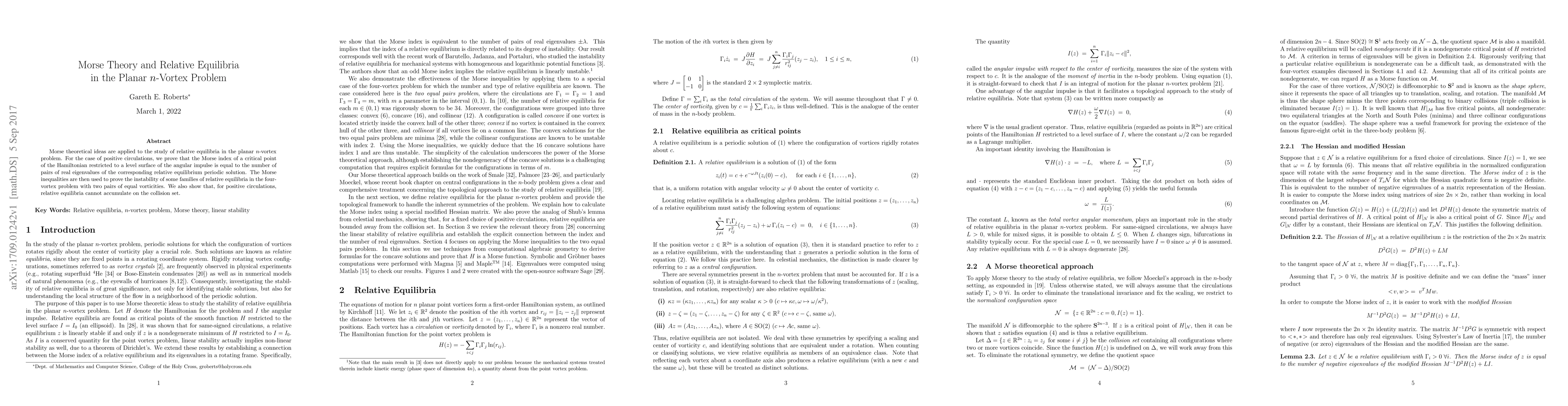 This paper applies Morse theory to analyze relative equilibria in the planar $n$-vortex problem, proving that the Morse index of critical points corresponds to the number of real eigenvalue pairs of periodic solutions. It also demonstrates the instability of certain four-vortex equilibria and shows that relative equilibria cannot accumulate on collision sets for positive circulations.