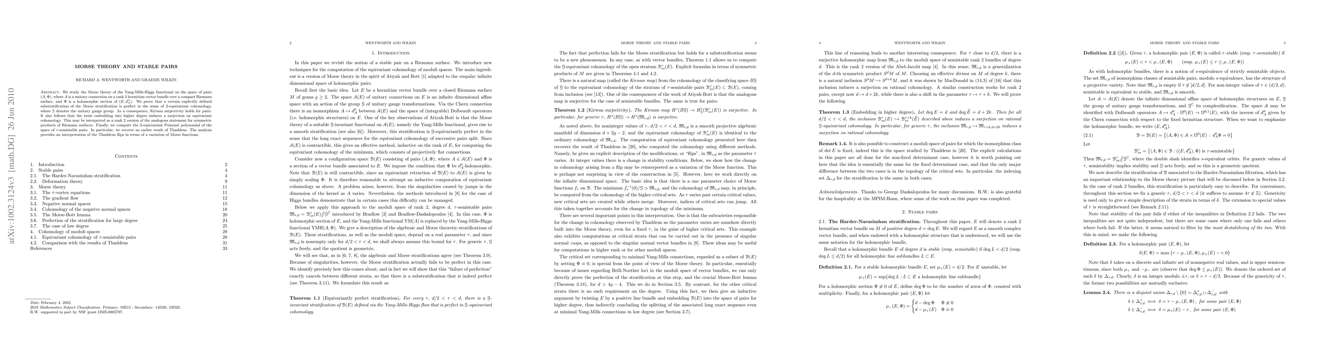 This paper applies Morse theory to the Yang-Mills-Higgs functional on stable pairs of connections and holomorphic sections, proving perfectness in $\G$-equivariant cohomology and establishing Kirwan surjectivity for these pairs. It also computes the $\G$-equivariant Poincaré polynomial, interpreting Thaddeus flips via variations in Morse functions.