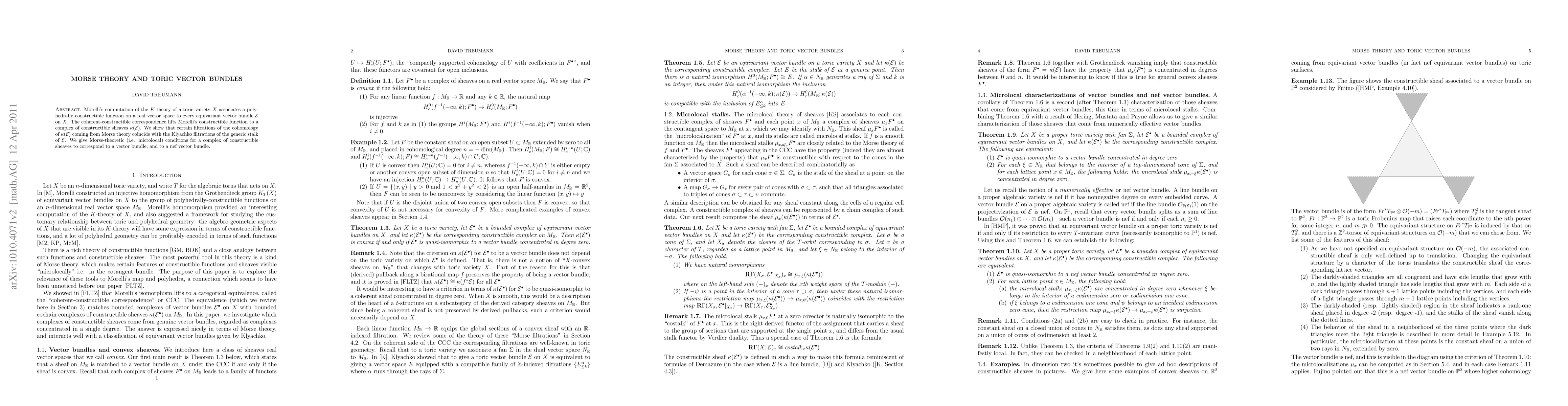 Morelli's computation of the K-theory of a toric variety X associates a polyhedrally constructible function on a real vector space to every equivariant vector bundle E on X. The coherent-constructible correspondence lifts Morelli's constructible function to a complex of constructible sheaves kappa(E). We show that certain filtrations of the cohomology of kappa(E) coming from Morse theory coincide with the Klyachko filtrations of the generic stalk of E. We give Morse-theoretic (i.e. microlocal) conditions for a complex of constructible sheaves to correspond to a vector bundle, and to a nef vector bundle.