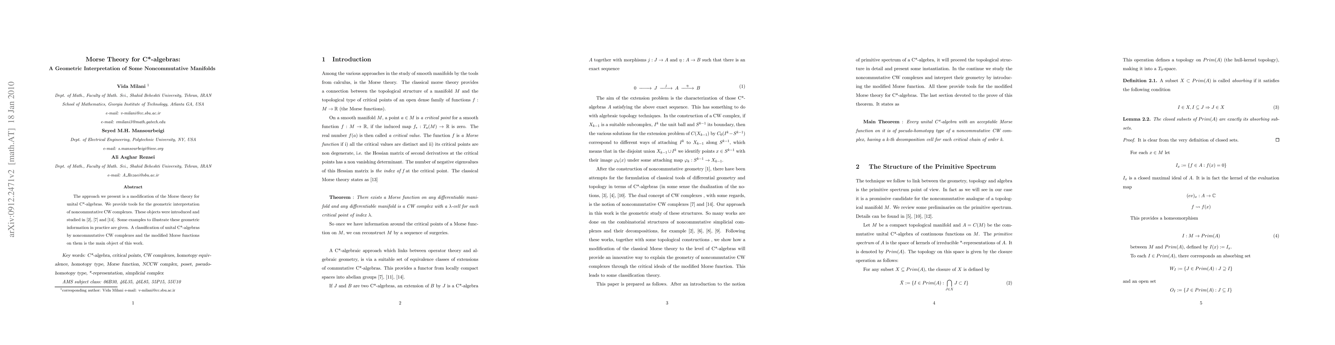 This paper applies Morse theory to noncommutative manifolds in C*-algebras, providing a geometric interpretation of CW complexes and a classification method for unital C*-algebras.