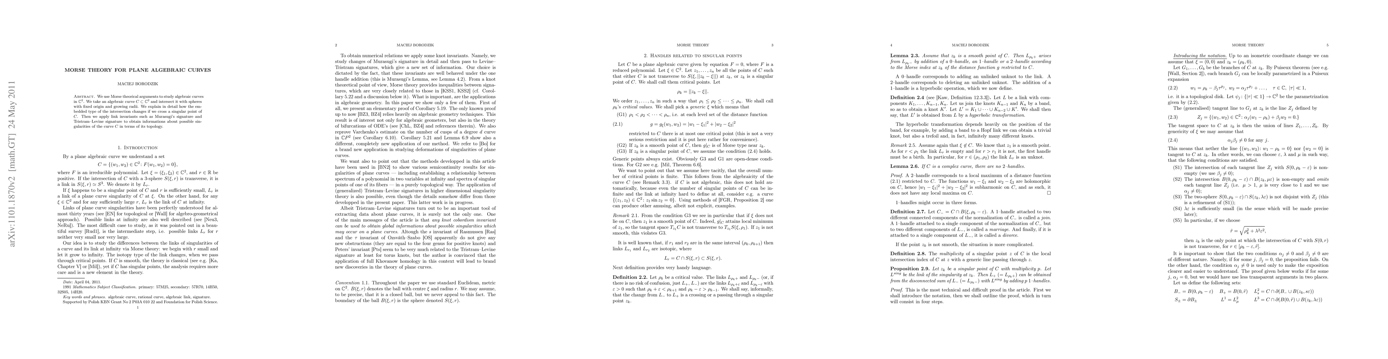 We use Morse theoretical arguments to study algebraic curves in C^2. We take an algebraic curve C in C^2 and intersect it with a family of spheres with fixed origin and varying radii. We explain in detail how does the resulting link change when we cross a singular point of C. Applying link invariants as Murasugi's signature and Levine--Tristram signatures we obtain some informations about possible singularities of a curve C in terms of its topology.