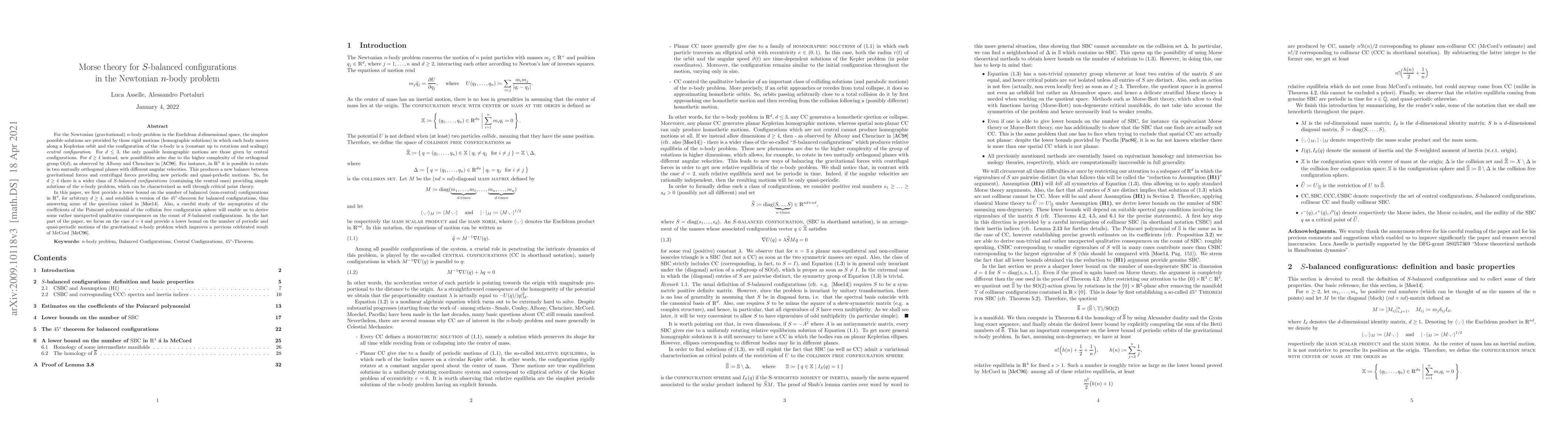 This paper employs Morse theory to investigate $S$-balanced configurations in the Newtonian $n$-body problem, focusing on $\mathbb{R}^d$ for $d \geq 4$. It establishes lower bounds for non-central balanced configurations and proves a $45^\circ$-theorem for these configurations, improving upon previous results regarding periodic and quasi-periodic motions.
