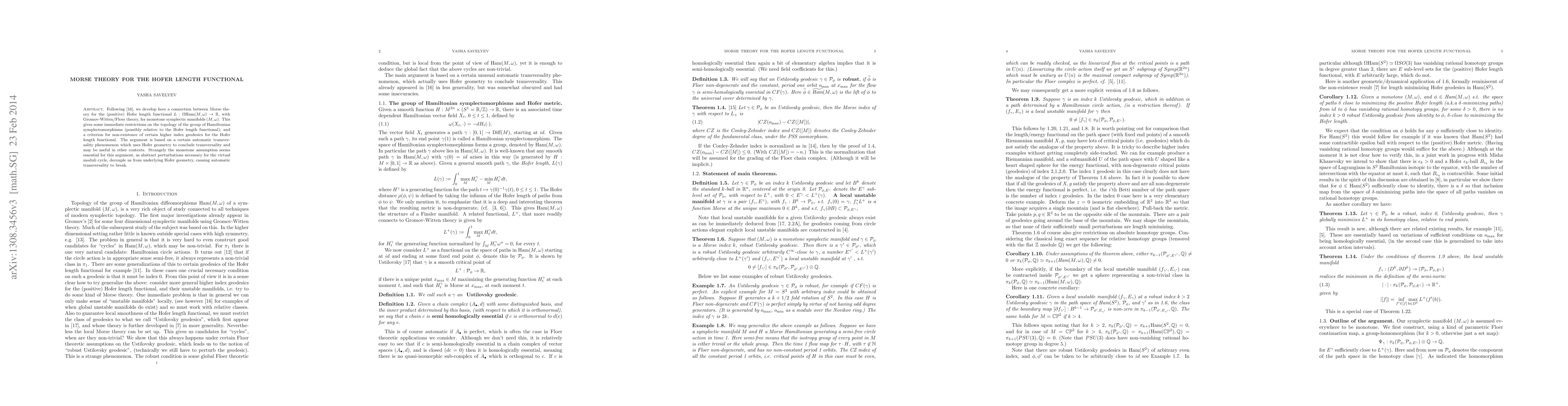 Following \cite{citeSavelyevVirtualMorsetheoryon$Omega$Ham$(Momega)$.}, we develop here a connection between Morse theory for the (positive) Hofer length functional $L: \Omega \text {Ham}(M, \omega) \to \mathbb{R}$, with Gromov-Witten/Floer theory, for monotone symplectic manifolds $ (M, \omega) $. This gives some immediate restrictions on the topology of the group of Hamiltonian symplectomorphisms (possibly relative to the Hofer length functional), and a criterion for non-existence of certain higher index geodesics for the Hofer length functional. The argument is based on a certain automatic transversality phenomenon which uses Hofer geometry to conclude transversality and may be useful in other contexts. Strangely the monotone assumption seems essential for this argument, as abstract perturbations necessary for the virtual moduli cycle, decouple us from underlying Hofer geometry, causing automatic transversality to break.