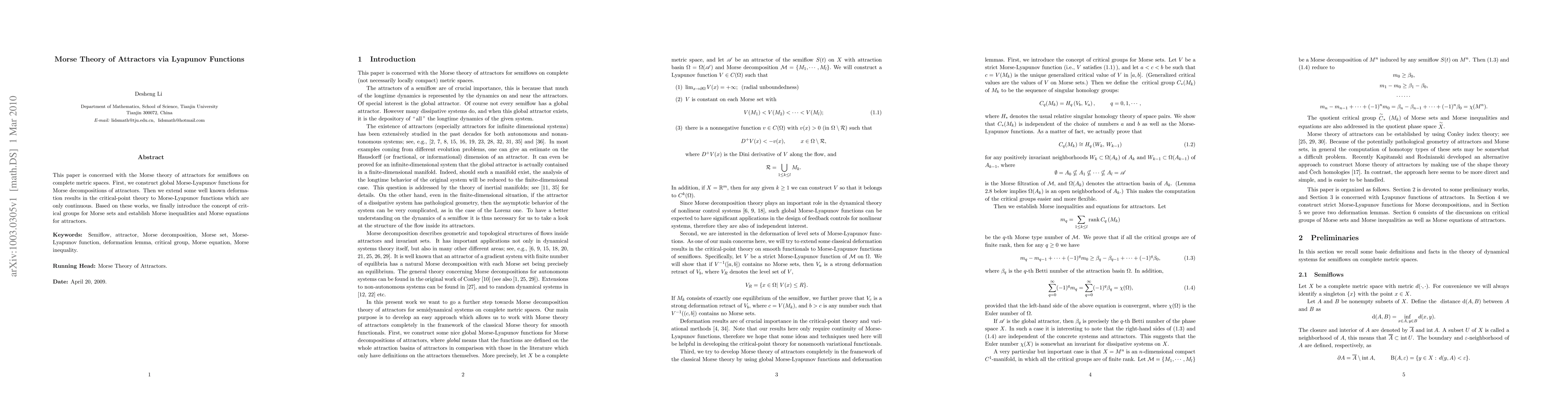 This paper develops Morse theory for attractors in semiflows using continuous Lyapunov functions, introducing critical groups, and establishing Morse inequalities and equations for attractors. The focus is on constructing global Morse-Lyapunov functions and extending critical-point theory results to this context.