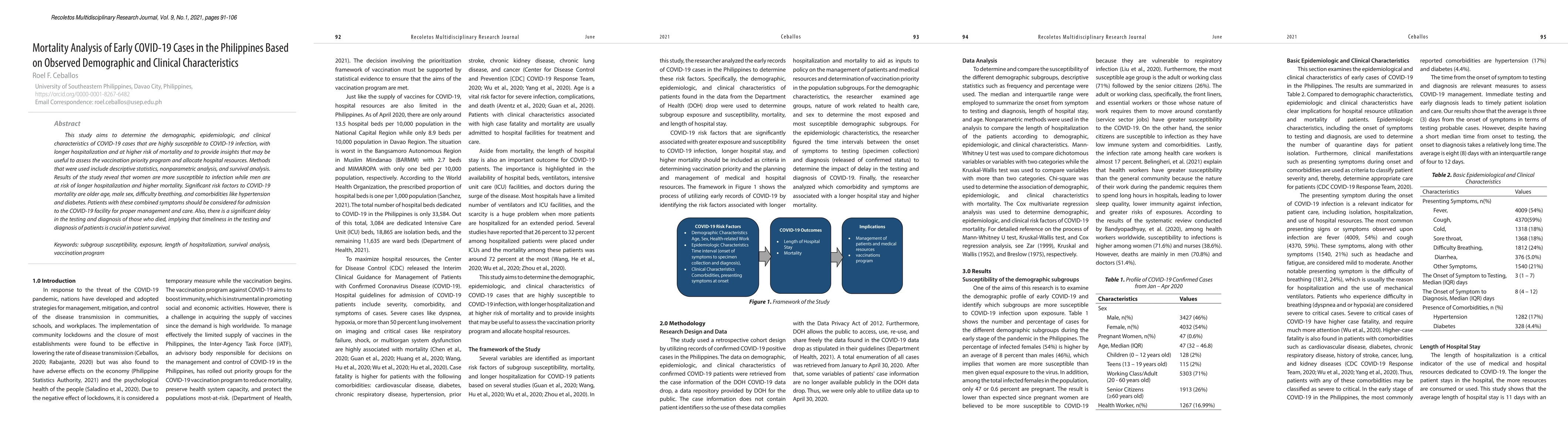 This study aims to determine the demographic, epidemiologic, and clinical characteristics of COVID-19 cases that are highly susceptible to COVID-19 infection, with longer hospitalization and at higher risk of mortality and to provide insights that may be useful to assess the vaccination priority program and allocate hospital resources. Methods that were used include descriptive statistics, nonparametric analysis, and survival analysis. Results of the study reveal that women are more susceptible to infection while men are at risk of longer hospitalization and higher mortality. Significant risk factors to COVID-19 mortality are older age, male sex, difficulty breathing, and comorbidities like hypertension and diabetes. Patients with these combined symptoms should be considered for admission to the COVID-19 facility for proper management and care. Also, there is a significant delay in the testing and diagnosis of those who died, implying that timeliness in the testing and diagnosis of patients is crucial in patient survival.