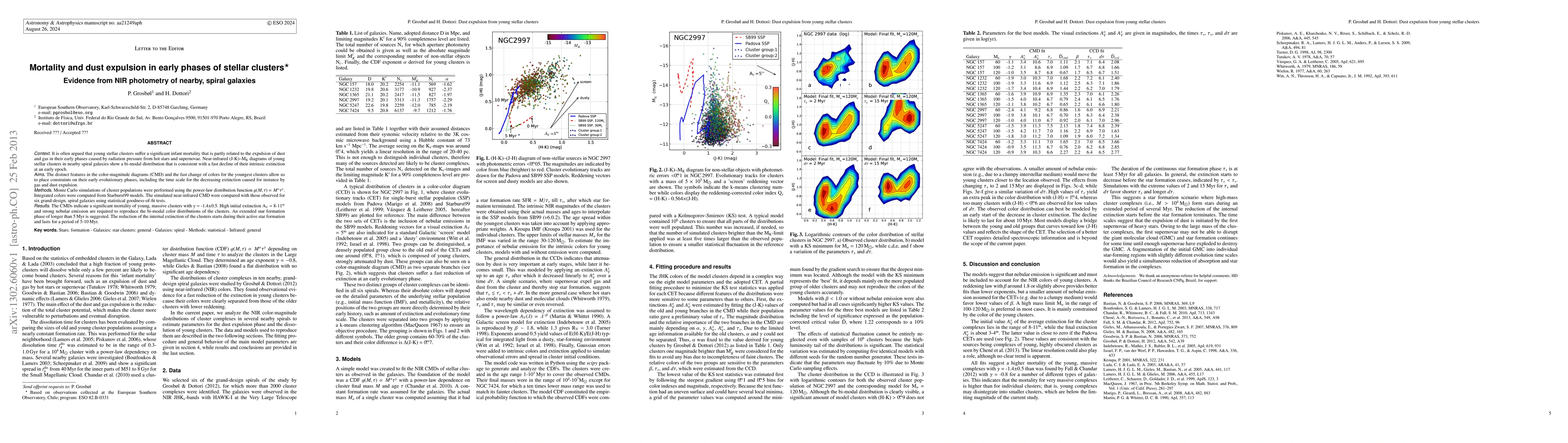 It is often argued that young stellar clusters suffer a significant infant mortality that is partly related to the expulsion of dust and gas in their early phases caused by radiation pressure from hot stars and supernovae. Near-infrared (J-K)-Mk diagrams of young stellar clusters in nearby spiral galaxies show a bi-modal distribution that is consistent with a fast decline of their intrinsic extinction at an early epoch. The distinct features in the color-magnitude diagrams (CMD) and the fast change of colors for the youngest clusters allow us to place constraints on their early evolutionary phases, including the time scale for the decreasing extinction caused for instance by gas and dust expulsion. Monte Carlo simulations of cluster populations were performed using the power-law distribution function g(M, t) ~ M^a t^gam. Integrated colors were computed from Starburst99 models. The simulated near-infrared CMD were compared with those observed for six grand-design, spiral galaxies using statistical goodness-of-fit tests. The CMDs indicate a significant mortality of young, massive clusters with gam = -1.4 +-0.5. High initial extinction Av = 8-11m and strong nebular emission are required to reproduce the bi-modal color distributions of the clusters. An extended star formation phase of longer than 5 Myr is suggested. The reduction of the internal extinction of the clusters starts during their active star formation and lasts for a period of 5-10 Myr.