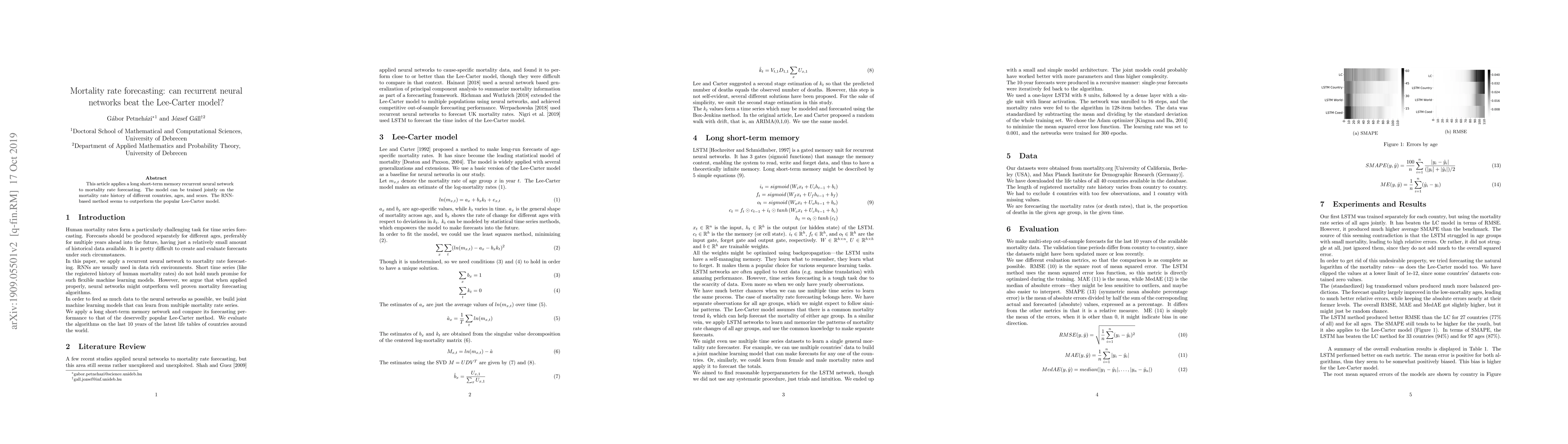 Summary: This research employs a long short-term memory recurrent neural network (RNN) for forecasting mortality rates, demonstrating its potential to outperform the established Lee-Carter model. The RNN model's ability to train jointly on diverse datasets enhances its predictive accuracy.